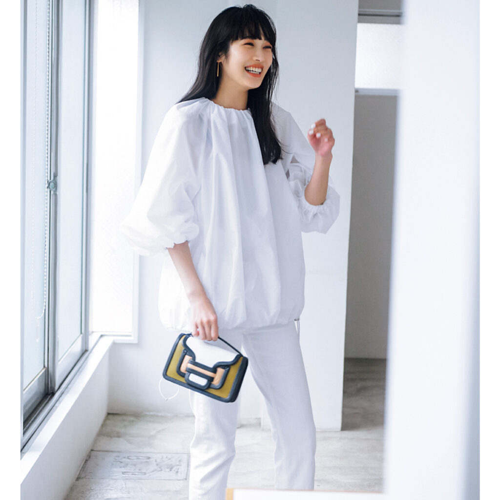 のっぺりしたくない〝まっしろ〟コーデ、シルエットやデザインでメリハリを効かせるとうまいくいく!ブラウス¥31,900(ユナイテッドアローズ/ユナイテッドアローズ 丸の内店)パンツ¥39,600(マザー/リトルリーグ)ピアス¥11,000(ワンエーアールバイウノアエレ/ウノアエレ ジャパン)サンダル¥125,400(セルジオ ロッシ/セルジオ ロッシ カスタマーサービス)バッグ¥143,000(ピエール アルディ/ピエール アルディ 東京)