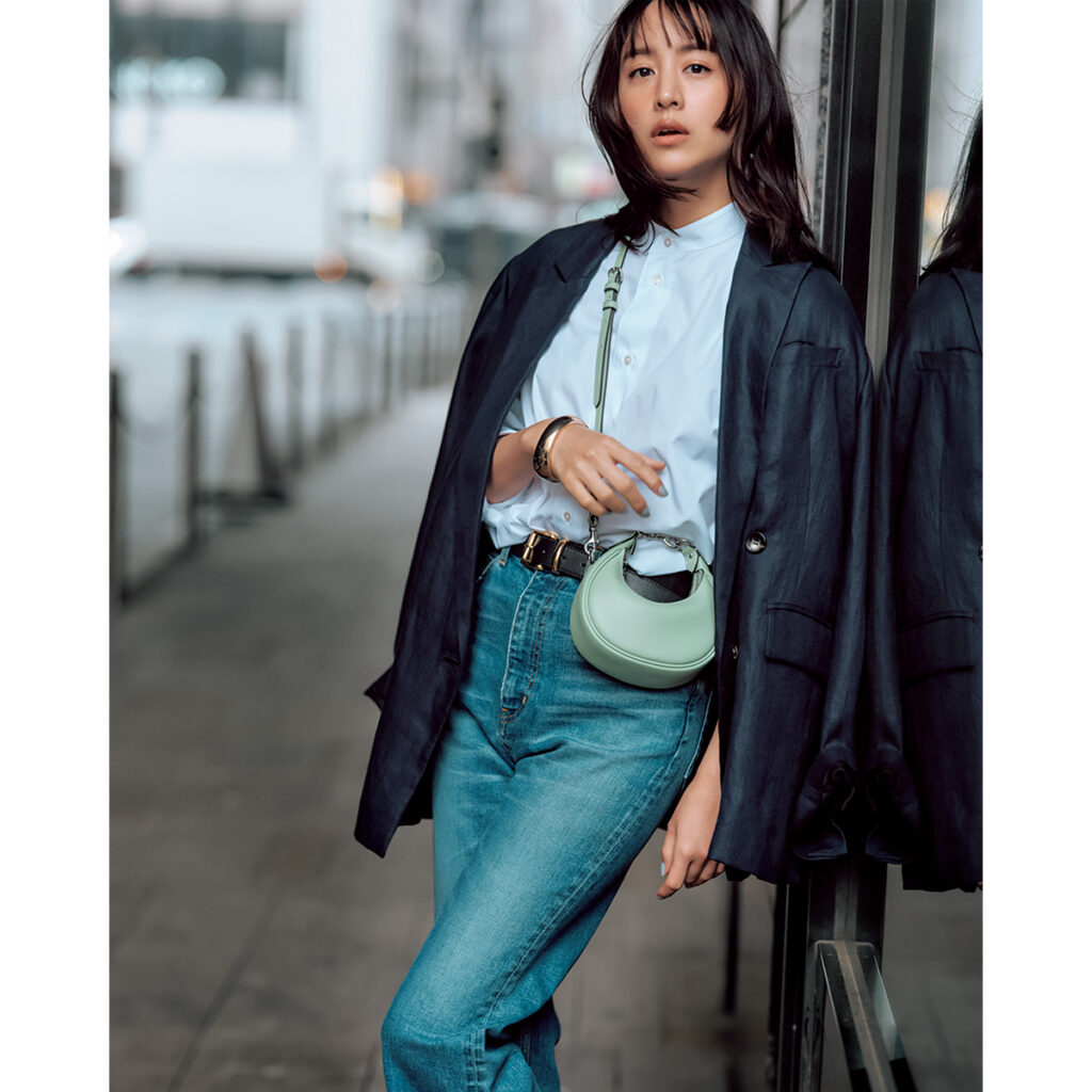 バンドカラーのボタンを一番上まで全部留めて、デニムにインして、仕上げにベルトを。ちなみにデニムはフレアシルエット。デザインや着方に新しいアイデアを加えながら、自分らしいと胸を張れるコーディネートを育てていきたい。シャツ¥38,500(ロエフ/エイチ ビューティー&ユース)ジャケット¥86,900(サクラ/インターリブ)デニムパンツ¥39,600(RH ヴィンテージ/ロンハーマン)ベルト¥15,400(アルアバイル)バッグ¥49,500(コーチ/コーチ・カスタマーサービス・ジャパン)イヤリング¥24,300バングル¥9,900(ともにアビステ)