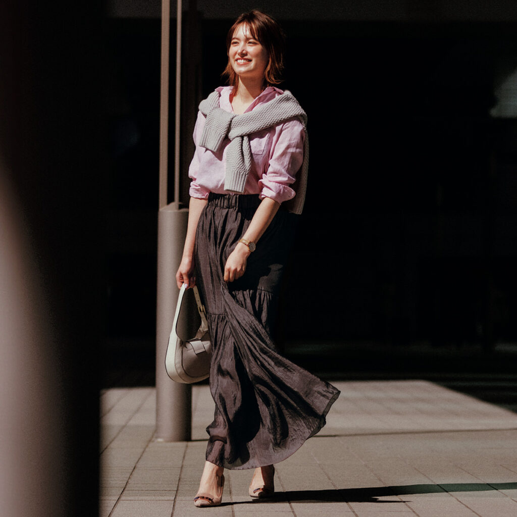 ピンクシャツ×スカートのフェミニンな組合せも、カジュアルな素材感やニットを肩掛けして大人のこなれ感を。シャツ¥42,900(フランク&アイリーン/サザビーリーグ)スカート¥49,500(サクラ/インターリブ)カーディガン¥39,600(スローン/ザ ショップ スローン 新静岡セノバ店)バッグ¥64,900(FURLA/FURLA JAPAN)パンプス¥130,900(セルジオ ロッシ/セルジオ ロッシ カスタマーサービス)時計¥17,050(クルース/HIROB ルミネ新宿店)ピアス¥121,000(マリハ)