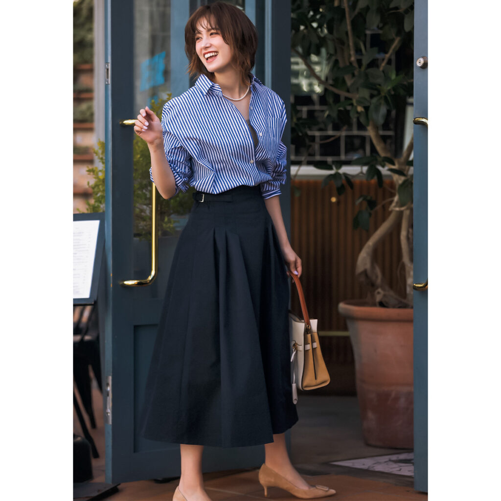 張りのある素材が美しいネイビーのスカートにストライプシャツで〝しごでき〟に⁉ インにタンクトップをレイヤードして抜け感をプラスし、ベーシックもさりげなく更新。スカート¥44,000(ダブルスタンダードクロージング/フィルム)シャツ¥12,980(ギャレスト/ワールドプレスインフォメーション)タンクトップ¥13,200(ボーダーズ アット バルコニー)バッグ¥148,500(トリー バーチ/トリー バーチ ジャパン)パンプス¥34,100(ツル バイ マリコ オイカワ)ネックレス¥22,000(ジゼルベー/ZUTTOHOLIC)