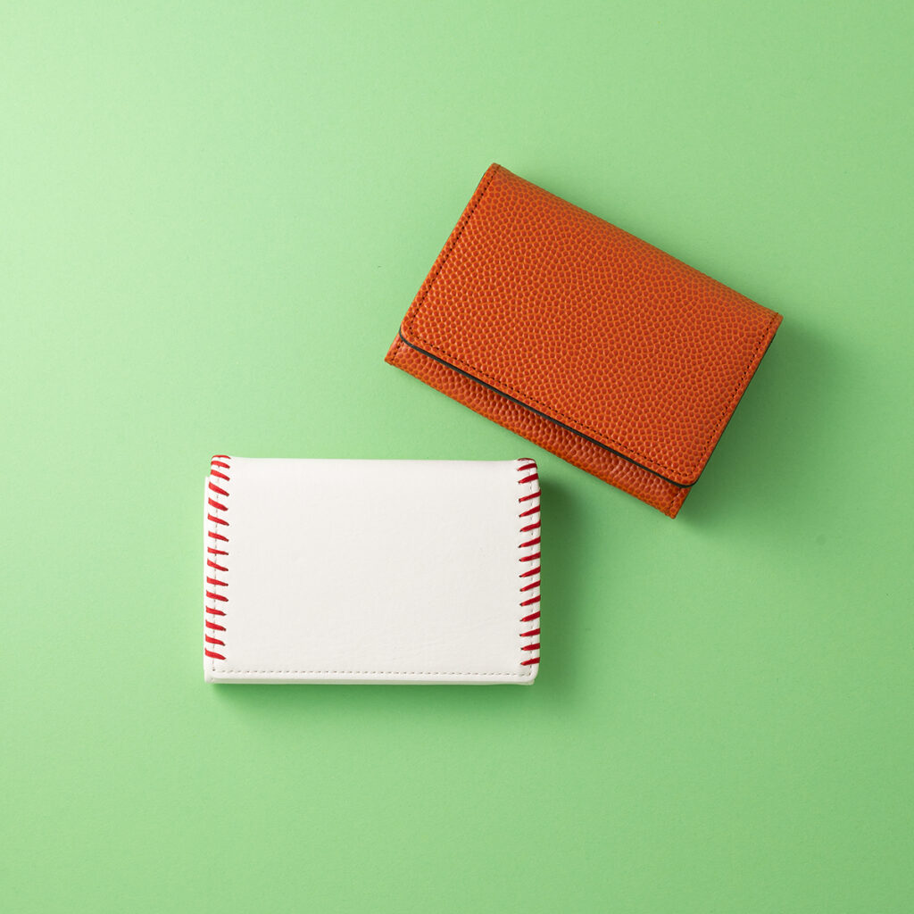 野球とバスケットのボールをモチーフにした名刺入れ。元運動部だった方へのプレゼントにも最適です。[上]バスケットボールの名刺入れ〈W11×H7.5×D2.5㎝〉¥8,800[下]野球の名刺入れ〈W11.5×H8×D2㎝〉¥8,800(ともにNADAYA SPORTS/ナダヤ)