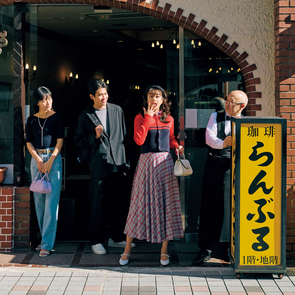コーヒーとシナモンのいい香りが漂う店内。喫茶店「らんぶる」でリョウと待ち合わせしていたのに、来ない。もう帰る!とピンクの電話を切って外へ出ると…あれ、リョウ、なんでここに!?尋ねたら「僕はリョウタだよ」って…確かに、よく見たら服が違う…というかみんな、なんかファッションが新鮮ね…。[ミヅキ]ニット¥17,600〈マカフィー〉スカート¥36,300〈トゥモローランド コレクション〉(ともにTOMORROWLAND)バッグ¥35,200スカーフ¥11,000(ともにアルアバイル)パンプス¥22,000(オデット エ オディール/オデット エ オディール 新宿店)カチューシャ¥9,900(レフィエ/フラッパーズ)イヤリング¥8,820(アビステ)[女性]ニット¥9,900(CELFORD/CELFORD ルミネ新宿2店)デニムパンツ¥16,500(ニードバイヘリテージ/ゲストリスト)バッグ¥14,300サンダル¥14,850(ともにダイアナ/ダイアナ 銀座本店)ベルト¥15,400(ギャルリー・ヴィー/ギャルリー・ヴィー 丸の内店)ネックレス¥9,900(イン ムード/フォーティーン ショールーム)[男性/右ページ上]レザージャケット¥121,000(アルマ/トレメッツォ)[男性/左ページ]ジャケット¥75,900パンツ¥46,200(ともにエイトン/エイトン青山)カットソー¥27,500(コラム/エストネーション)スリッポン¥38,500〈ヨーク〉リュック¥13,200〈メデン〉(ともにHEMT PR)その他/スタイリスト私物[喫茶店マスター]メガネ¥46,200(アイヴァン/アイヴァン 東京ギャラリー)その他/スタイリスト私物