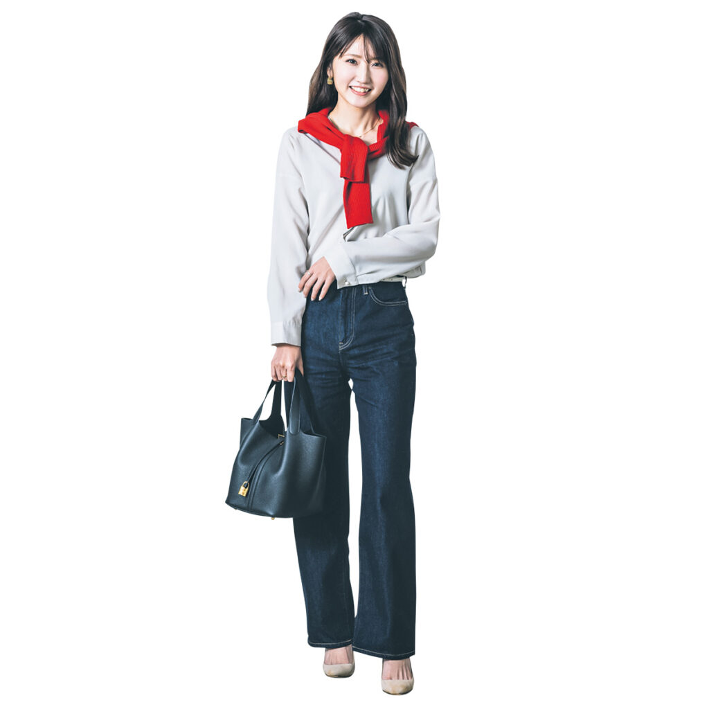 ノーカラー&パールボタンのシャツだからかっちりしすぎず、休日のデニムスタイルとも好相性!赤ニットを肩がけして、パリシックにまとめるのが気分。