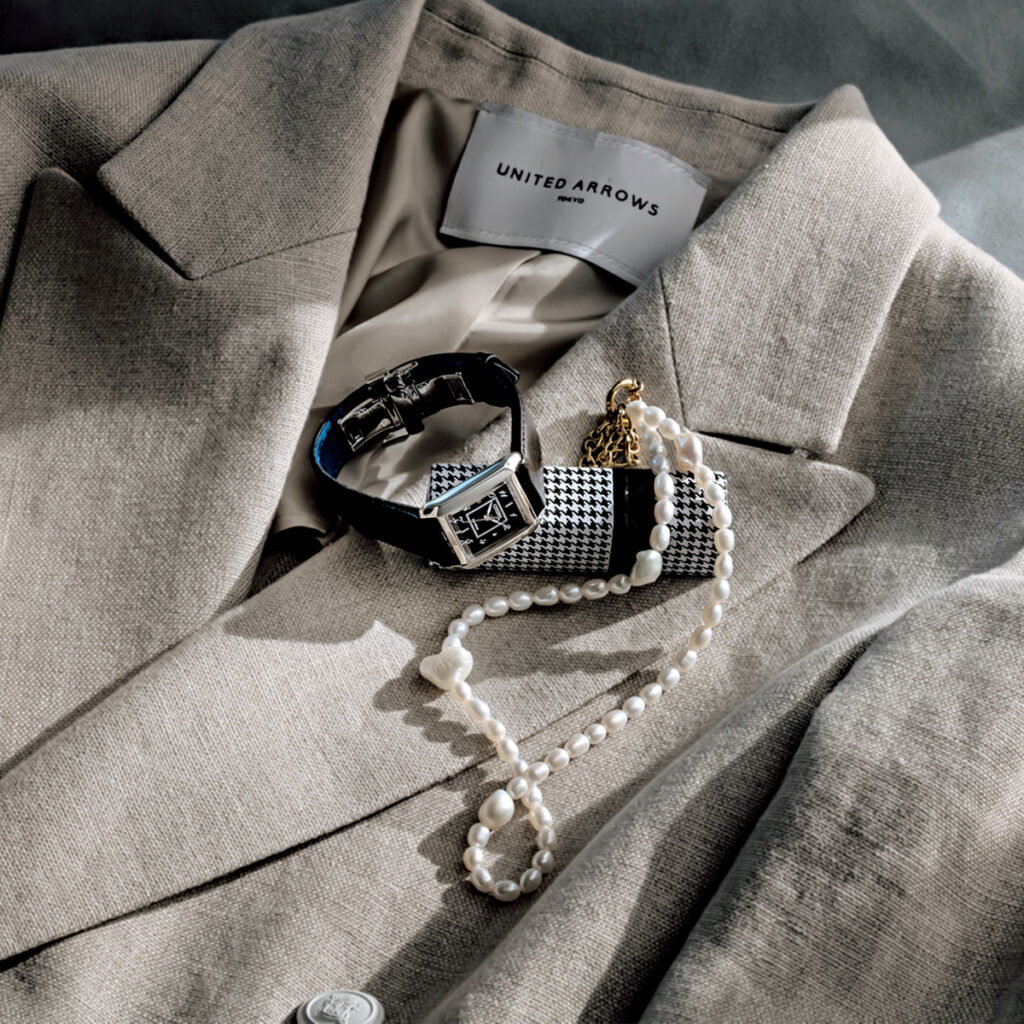 少し丸みを帯びたスクエアケースに、端正な黒ベルト。表情豊かなパールのネックレスを合わせて、肩の力の抜けた理想のトラッドスタイルに。時計〈SS,ケース21.5㎜〉¥33,000(シチズン エル/シチズンお客様時計相談室)ネックレス¥61,600(マリア ブラック/マリア ブラック 表参道店)ジャケット¥42,900(ユナイテッドアローズ/ユナイテッドアローズ 丸の内店)