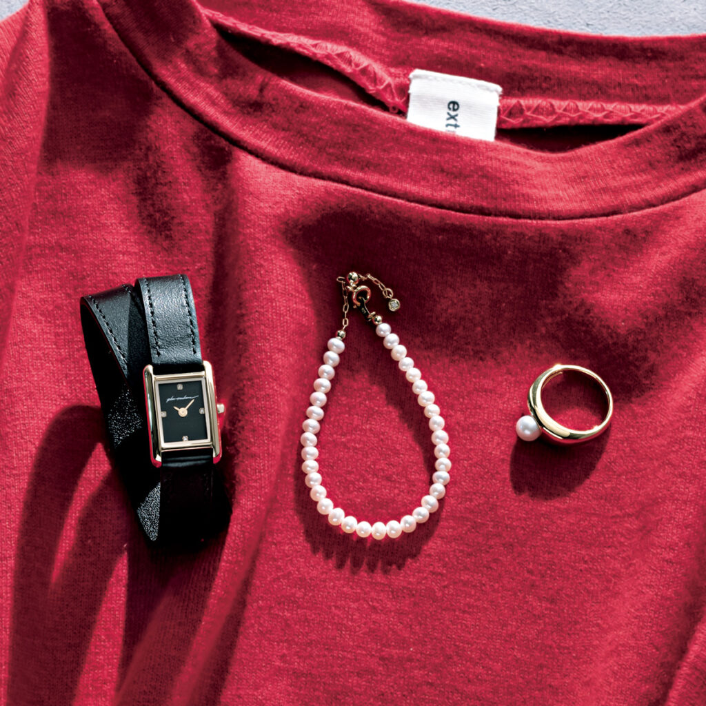 上品で知的な革ベルト時計の雰囲気に寄り添うパール。オブジェのようなフォルムや粒の大きさでリズムをつけて、こなれたバランスに仕上げるのが今の気分。