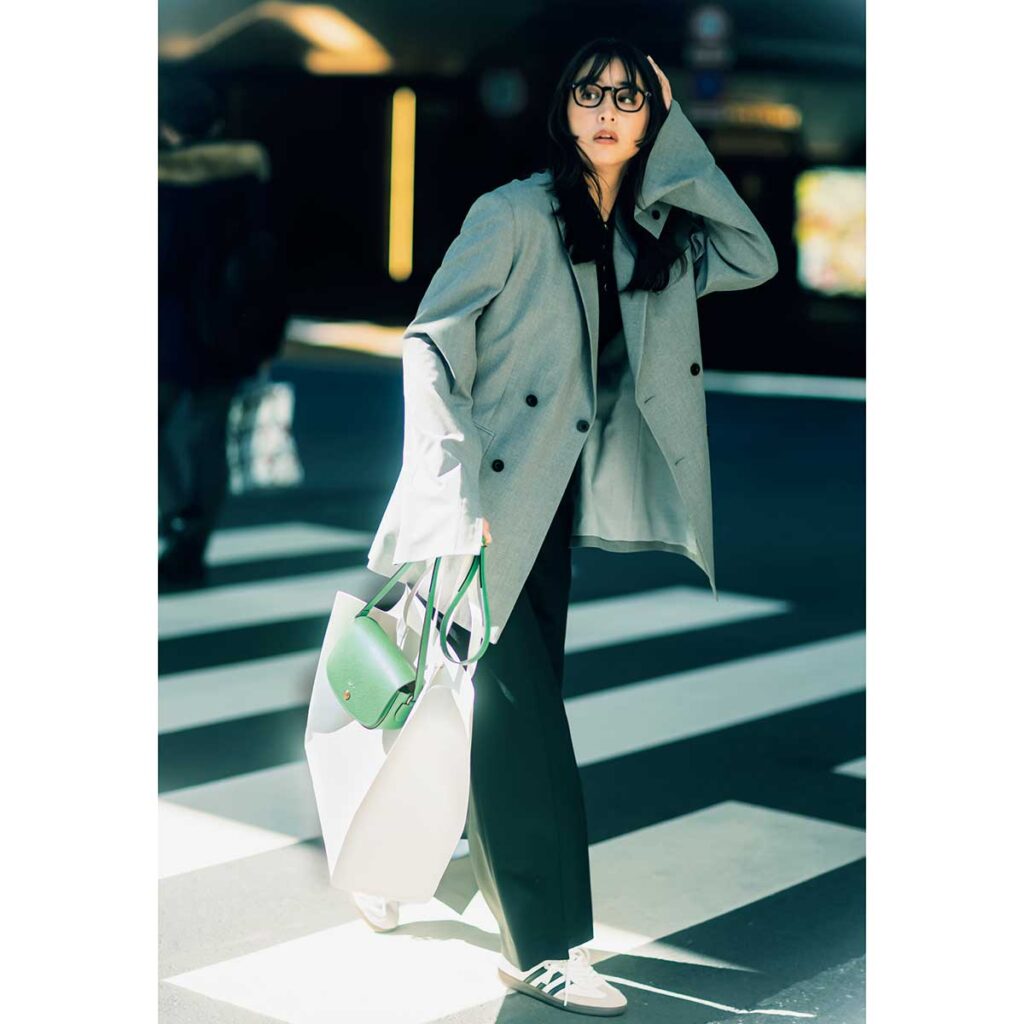 スニーカー「SAMBA OG」¥15,400(アディダス オリジナルス/アディダスお客様窓口)ジャケット¥104,500(ハイク/ボウルズ)ニット¥27,500(Theory)パンツ¥27,500(エイチ ビューティー&ユース)ショルダーバッグ¥53,900(ロンシャン/ロンシャン・ジャパン)トートバッグ¥19,800(ジアートオブキャリング/TTIME)めがね¥44,000(アイヴァン/アイヴァン 東京ギャラリー)ピアス¥58,300(モニス/フォーティーン ショールーム)