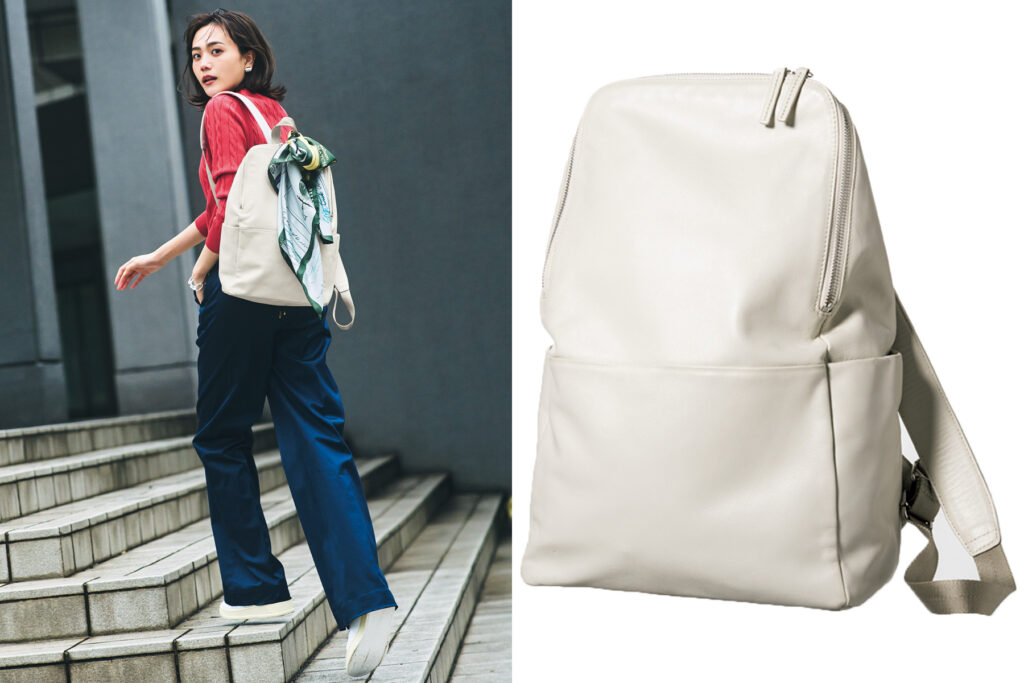 目を惹くロゴ付きのリュックを通勤用にも使うなら、大人っぽくハマる白が正解。クリーンな白でカジュアルコーデにメリハリを。カットソー¥17,600(ロンハーマン)ベスト¥31,900ジャケット¥52,800(ともにエーケーワン/ビームスハウス丸の内)デニムパンツ¥30,800(ザシンゾーン/シンゾーン表参道本店)スニーカー¥15,730(ナイキミーツエミ/エミニュウマン新宿店)ピアス¥19,800 バングル¥59,400(ともにアダワット トゥアレグ)高い収納力でありながら、PC用のスリーブや小物収納ポケットが充実しているのが魅力。バックパック〈H42×W32×D14㎝〉¥6,050(ジャンスポーツ/ユニグローブ)
