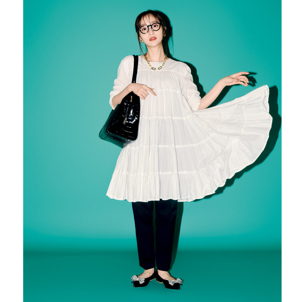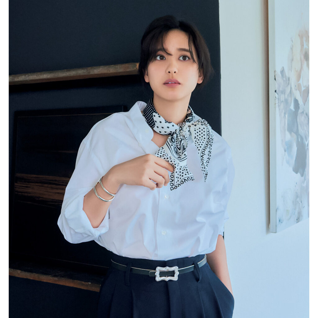 百々千晴さんがディレクションする黒デニムは、きちんと見えるうえに美脚効果も抜群!春は、淡い青シャツと組合せた爽やかな装いがしたくなります。
