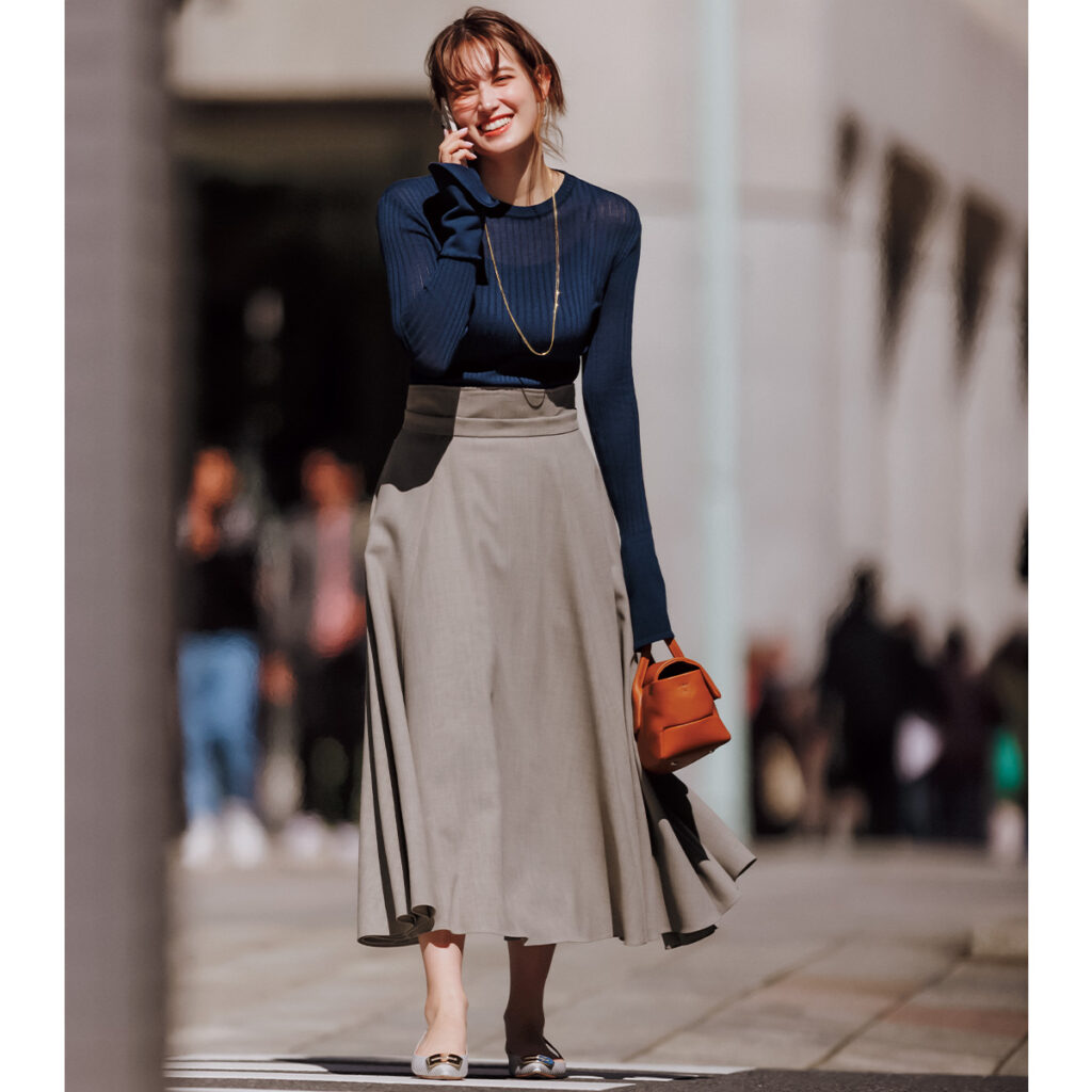 コルセット風ベルトでスタイル良く見えるスカートと、フレア袖が可愛いニットでワンツーコーディネートに。ディテールにこだわって、落ち着いた配色でも華やぎある印象に。スカート¥61,600(ebure/ebure GINZA SIX店)ニット¥29,700(マイ ウィークネス)バッグ¥372,900(トッズ/トッズ・ジャパン)パンプス¥75,900(ペリーコ/アマン)ピアス¥99,000ネックレス¥22,000(マリハ)