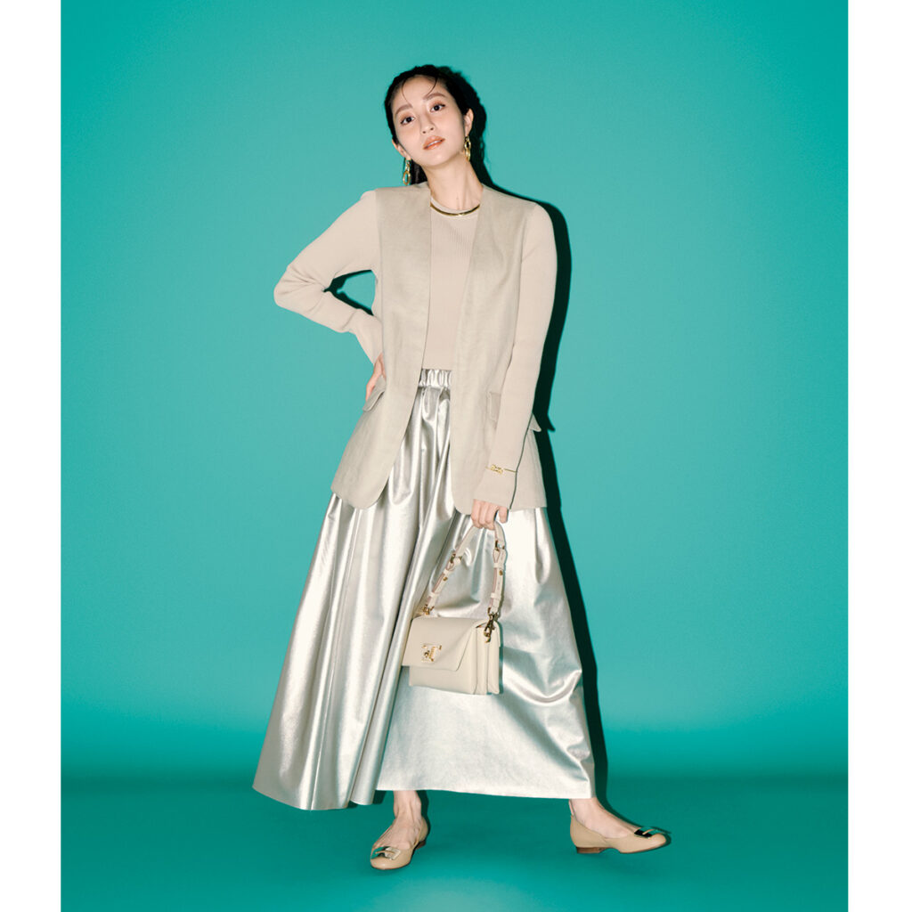 控えめな光沢感なら大人っぽく取り入れられる。退勤後の華やかな予定にもぴったり。スカート¥39,600(THIRD MAGAZINE)ジレ¥39,600(ギャルリー・ヴィー/ギャルリー・ヴィー 丸の内店)リブニット¥20,900(ウィム ガゼット/ウィム ガゼット ルミネ新宿店)バッグ¥355,300(トッズ/トッズ・ジャパン)パンプス¥74,800(ペリーコ/アマン)ピアス¥8,800〈ワンエーアールバイウノアエレ〉ネックレス¥478,500バングル¥151,800〈ともにウノアエレ〉(すべてウノアエレ)