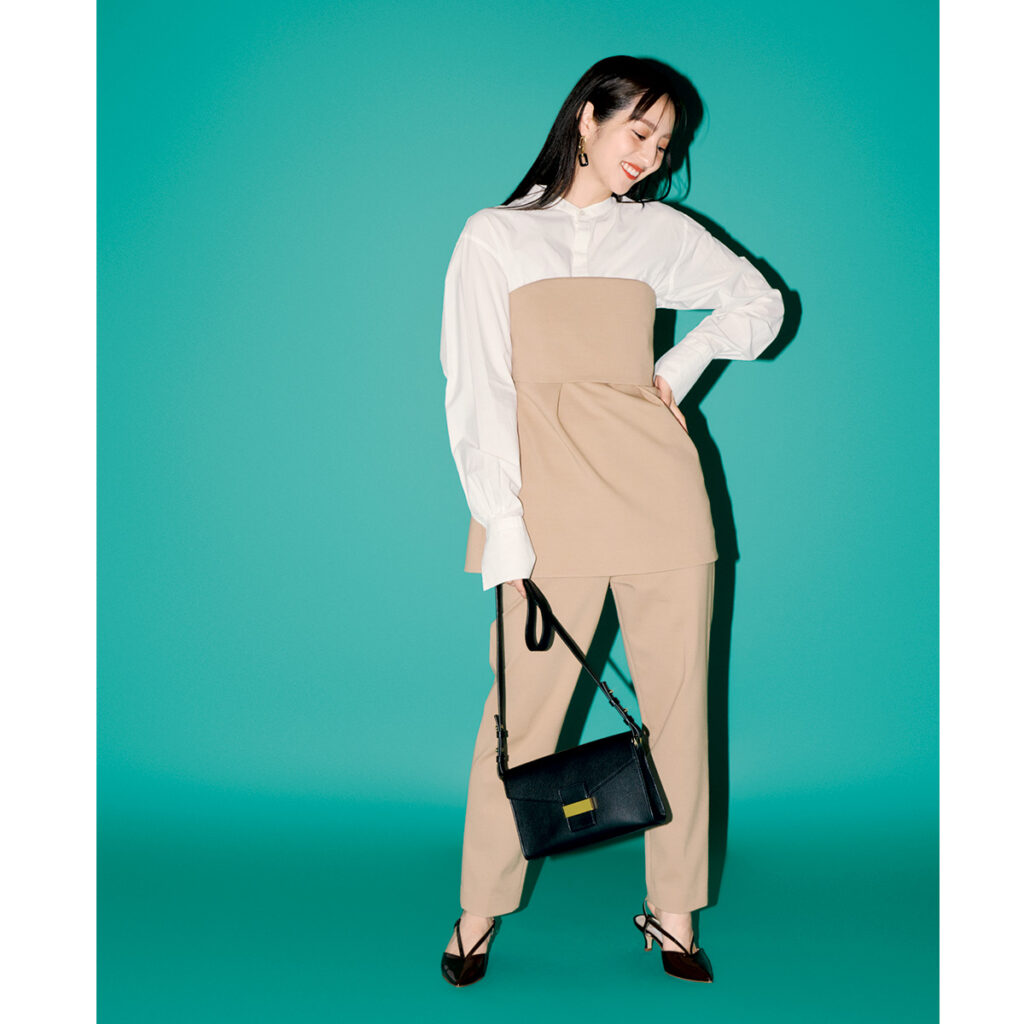 スウェットトップス¥23,100(ギャルリー・ヴィー/ギャルリー・ヴィー 丸の内店)シャツ¥17,600(ジャスグリッティー/ジャスグリッティー プレスルーム)スカート¥56,100(ユニオン ランチ/サザビーリーグ)バッグ¥170,500(ピエール アルディ/ピエール アルディ 東京)パンプス¥39,600(ピッピシック/ベイジュ)ピアス¥12,100バングル¥28,600(ともにワンエーアールバイウノアエレ/ウノアエレジャパン)ネックレス¥58,080(ペヨテ・バード・デザイン/ZUTTOHOLIC)
