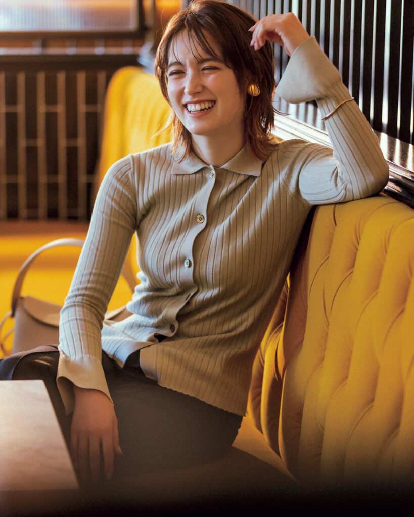 リブカーデから一歩進んだ衿付きできちんと感と親近感を同時に演出