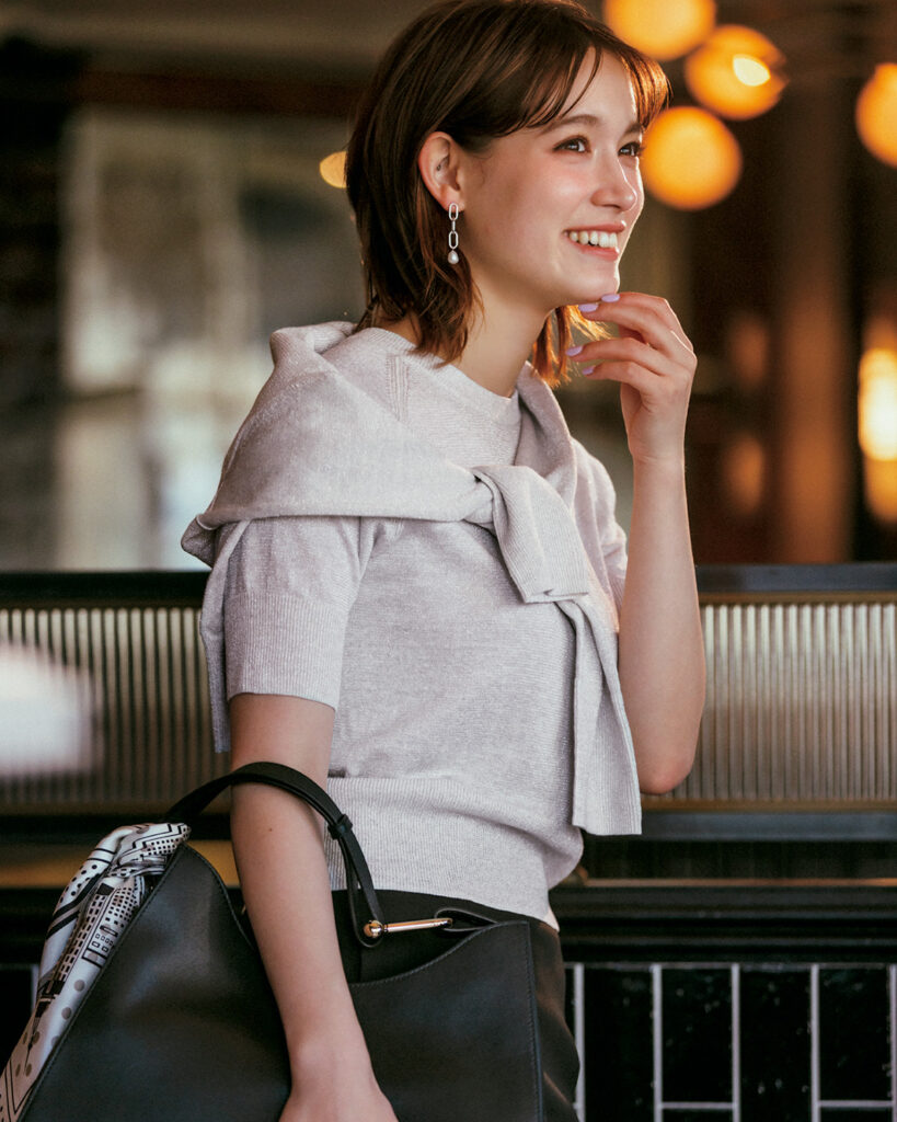 淡色同士の組合せを黒小物でキリリと。ショートパンツ¥39,600 (ebure/ebure GINZA SIX店)ニットカーディガン¥35,200ニットトップス¥27,500(ともにカオス/カオス 丸の内)ベルト¥17,600(レフィージェ/エッセンス・オブ・アナイ/ANAYI)バッグ¥424,600ローファー¥127,600(ともにトッズ/トッズ・ジャパン)メガネ¥36,300(アイヴァン/アイヴァン 東京ギャラリー)ピアス¥11,000(ワンエーアールバイウノアエレ/ウノアエレ ジャパン)ネックレス¥24,200(ローラ ロンバルディ/八木通商)ソックス/スタイリスト私物