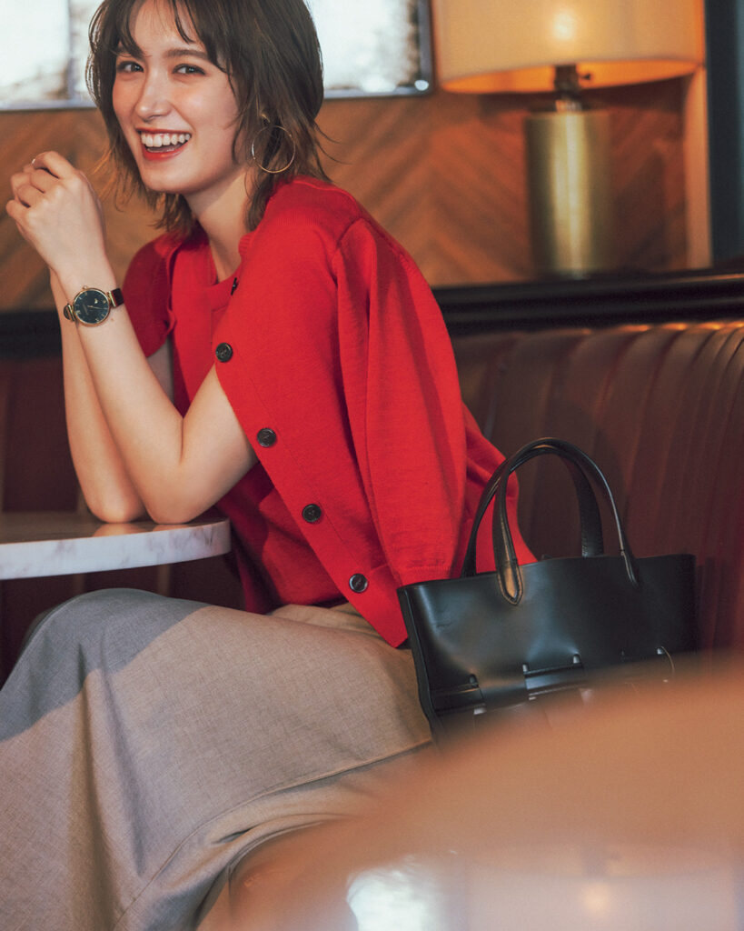 顔周りを明るく印象的に見せてくれる朱赤のニットは好感度抜群。カーディガンを羽織ったり、巻いたり…シーンによって着こなしを変えられるのも便利!