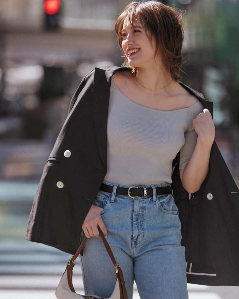 ジャケットの下はちょっぴり大胆な肌見せトップスを仕込んで今っぽく