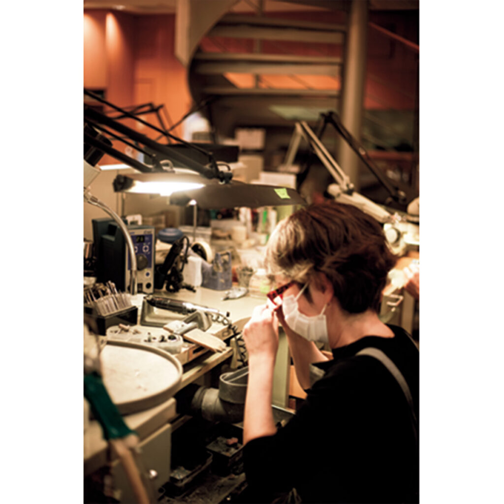 小泉:元町には貴金属店も多かったそうです。でもお店の中に職人を抱えたのは当社だけ。今もデザイン企画・原型製作・仕上げ・アフターサービスと、すべてを自社で行っているのが強みですね。先ほども見学していただいたように、本社・本店と工房は目と鼻の距離にあります。物理的にも精神的にもデザイナーと職人の距離が近く、一丸となってモノづくりができると感じています。職人は職人でこだわりがあり、着け心地などに一切の妥協を許しません。一般的にはひとつの型で製作するリングも、すべてのサイズの型を作ってから製作するのがこだわり。製作段階でデザイン修正することも。広報担当としては、サンプルがいつできあがるのか…とハラハラすることもありますが(笑)、それだけ良いものができると思います。