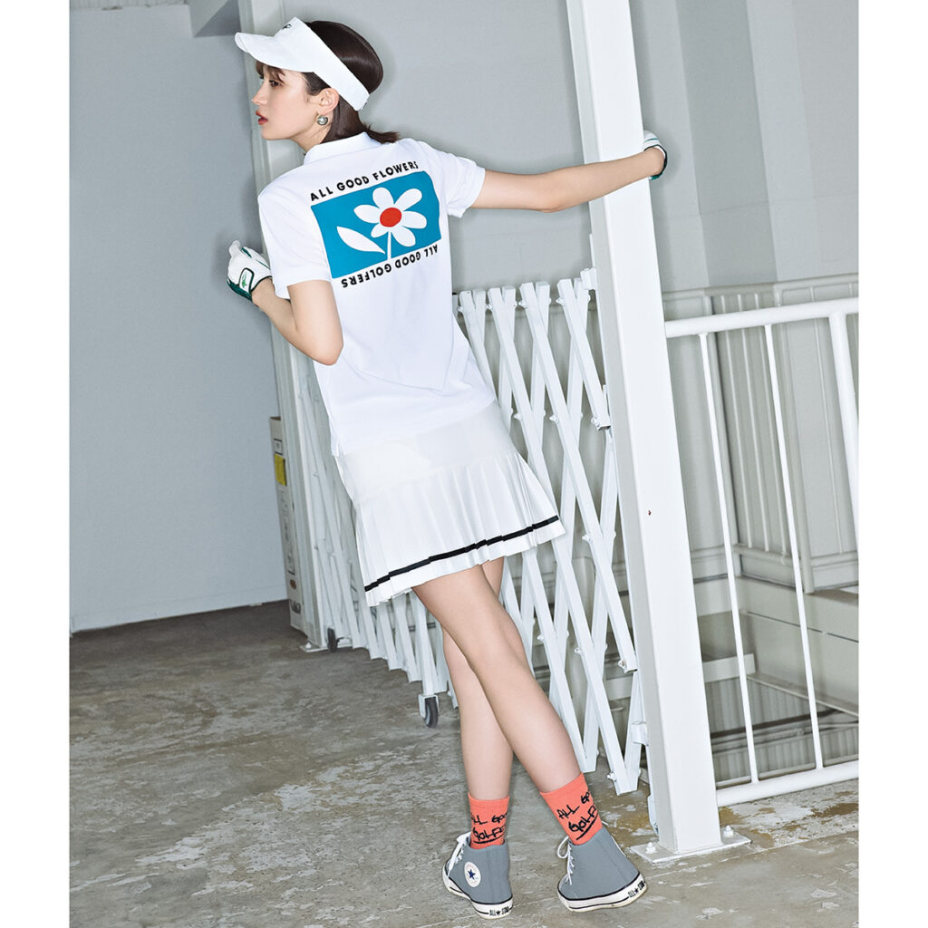 [Risa]モックネックのトップスにハーフジップのニットプルオーバーをレイヤードして立体感のある着こなしに。インナーとスカートを黒で統一すれば着痩せ効果も期待できます。ハーフジップニットプルオーバー¥14,300トップス¥11,000キャップ¥5,280グローブ[片手]¥2,750ソックス¥1,980(すべてニューバランス/TSI ニューバランス ゴルフ セクション)ゴルフシューズ[OPEN価格](ニューバランス/ニューバランスジャパン お客様相談室)スカート¥16,500(ユナイテッドアローズ ゴルフ/ユナイテッドアローズ 六本木ヒルズ店)ピアス¥22,000(バルブス/ZUTTOHOLIC)[Sachi]ずっと使えて、機能美も抜群の「ポロ ラルフ ローレン ゴルフ」ポロシャツ¥19,800スカート¥25,300サンバイザー¥12,100グローブ[片手]¥6,600(すべてポロ ラルフ ローレン ゴルフ/ラルフ ローレン)ソックス¥1,045(靴下屋/タビオ)シューズ¥28,600(コール ハーン×ユナイテッド アローズ/ユナイテッドアローズ 六本木ヒルズ店)ピアス¥16,610(バルブス/ZUTTOHOLIC)クラブ(スタイリスト私物)