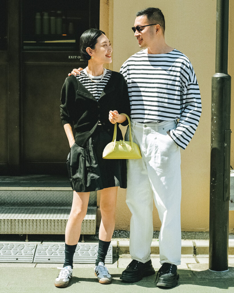 定番のボーダーTはお互いの柄面積に差をつけるのがポイント
