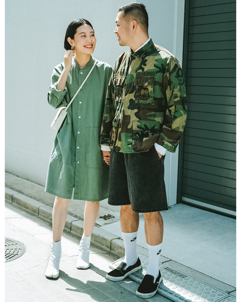 迷彩柄で分かりやすくリンクさせることもありますが、ちょっぴり落ち着いた雰囲気に仕上げたい時は、カーキ×迷彩でミリタリーテイストを演出。夫のロングシャツを拝借し、ワンピース風に着てみました。他にも、プレッピーやアメカジリンクを楽しんでいます。