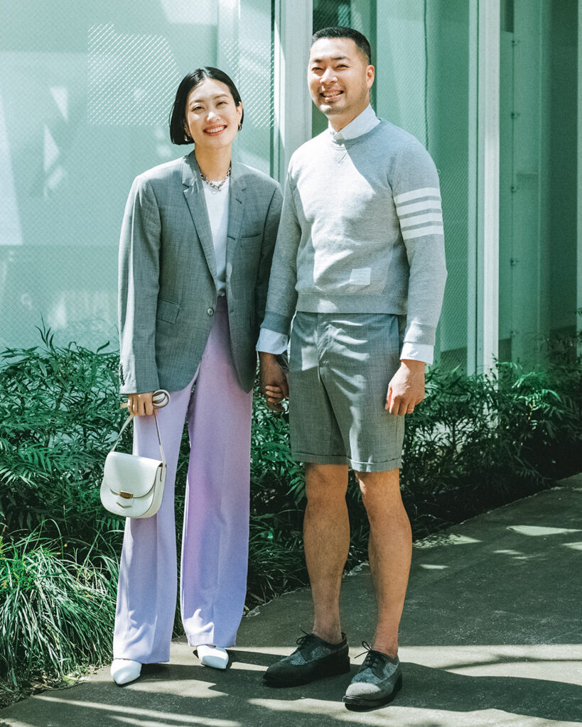 実はこのジャケット、夫のハーフパンツとセットアップのもの。色調の幅が広いグレーは、意外とリンク感が出にくいので、〝セットアップを2人で分ける〟という着こなしに辿り着きました。どの色でリンクさせる時も、必ず3 色以内におさめるようにしています。