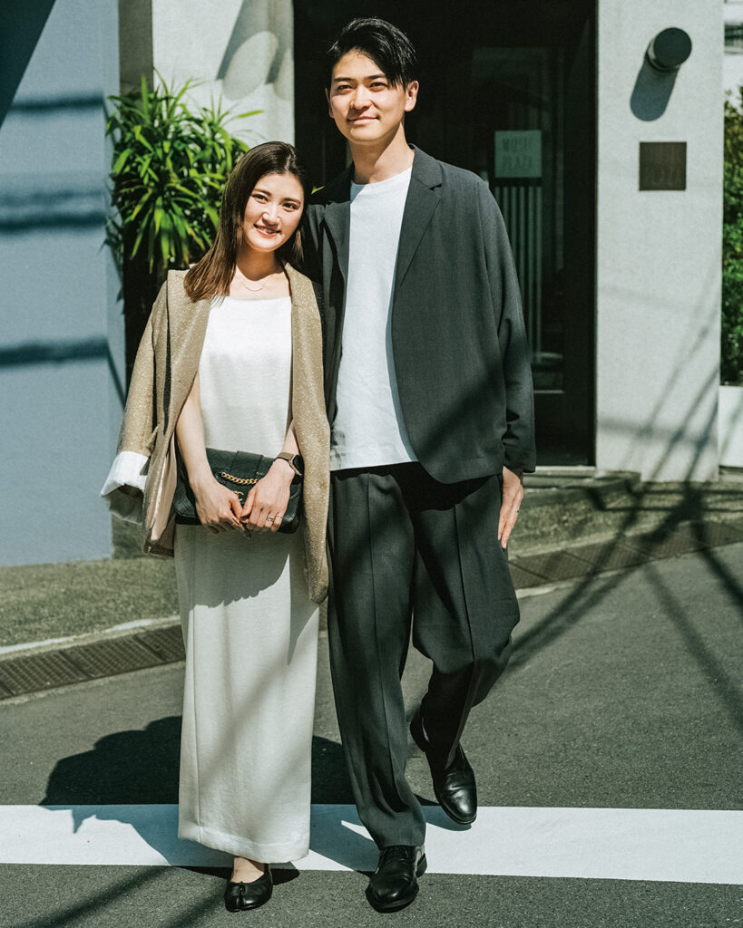 一軒家レストランで過ごす記念日はフォーマルながらリラクシーさを意識。ジャケットはリンク感が薄いので、それぞれをワントーンにし、統一感を出したのがポイントです。