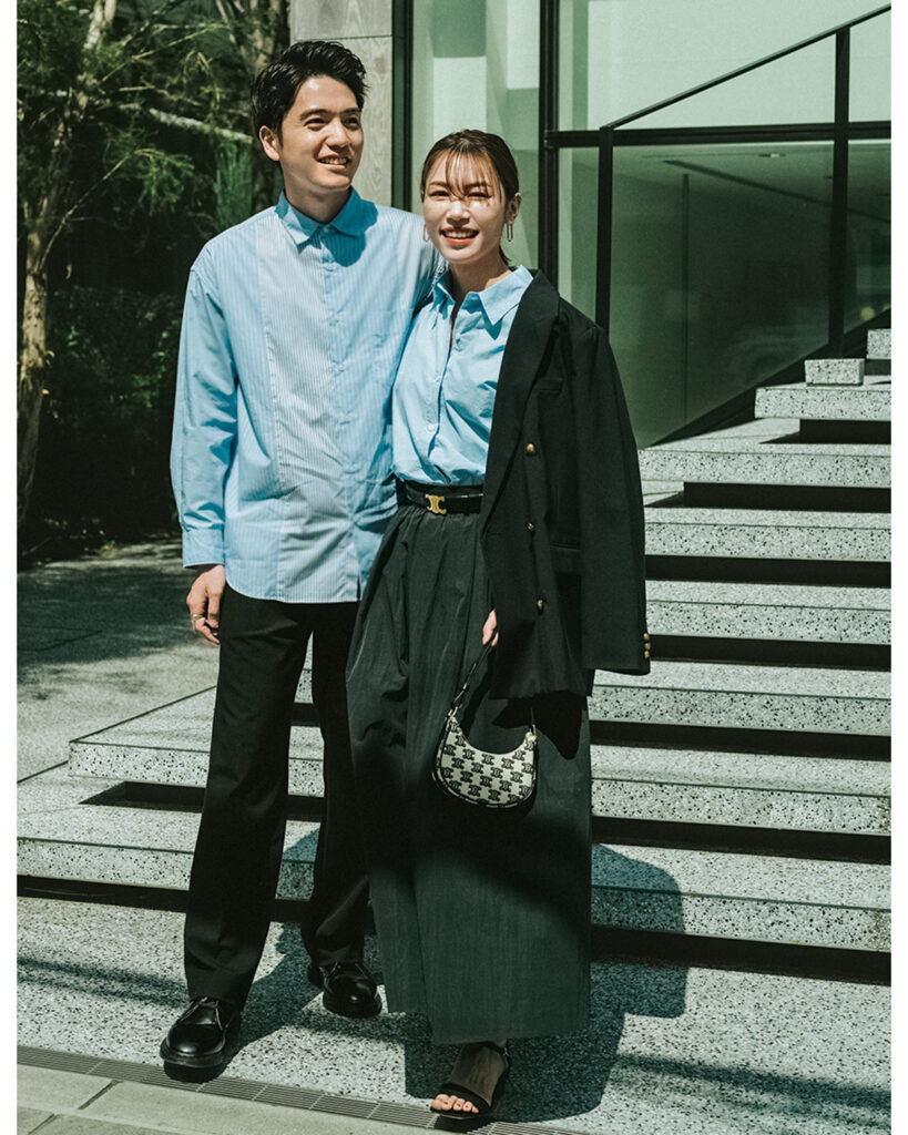 お互い好きなブルーシャツは、ホテルレストランで過ごす記念日にもぴったり。黒でキリッと引き締めます。私は無地を選んでジャケットを羽織り、彼はストライプ柄をアウトでシンプルに、と柄と着方を変えると◎