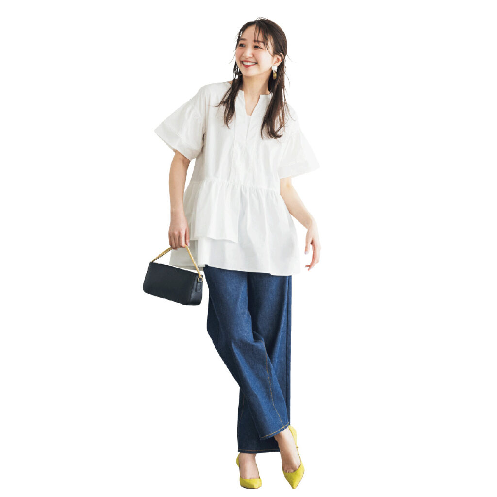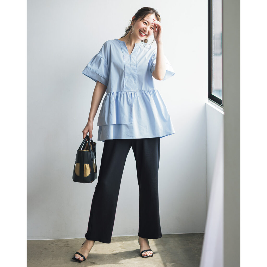 大人の甘め服で人気を集める「エマテイラー」にペプラムブラウスを別注。シンプルパンツとのシンプルコーデもきちんと映えて、オンにもオフにも活躍します。