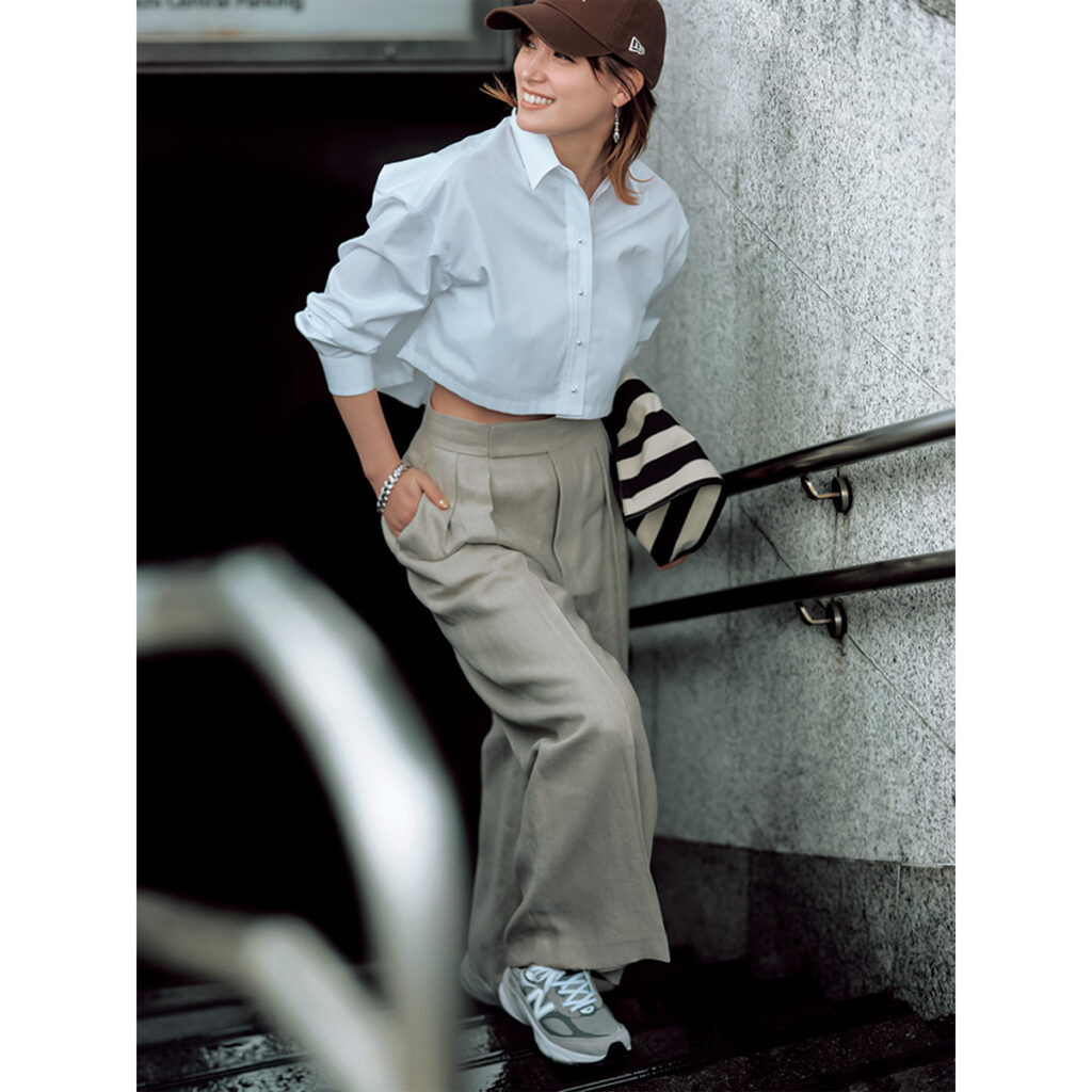 ベーシックの白シャツを旬顔にアップデートさせるなら、ショート丈を選ぶのも有効です。ツータックのワイドパンツにスニーカーを合わせ、あくまでもヘルシーに着こなすのがコツ。ストライプ柄のバッグで、スタンダード配色にモダンなエッセンスを効かせて。