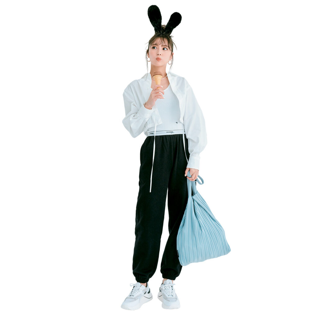 デイリーで着るには勇気が入る装いを楽しめるのも、テーマパークの醍醐味。ボディスーツ×スウェットパンツのラフな旬コーデは、モノトーンに徹することスタイリッシュに決まります。頼れるスタンダードアイテム・白シャツを羽織ることで品の良さが加わり、大人っぽい印象に。