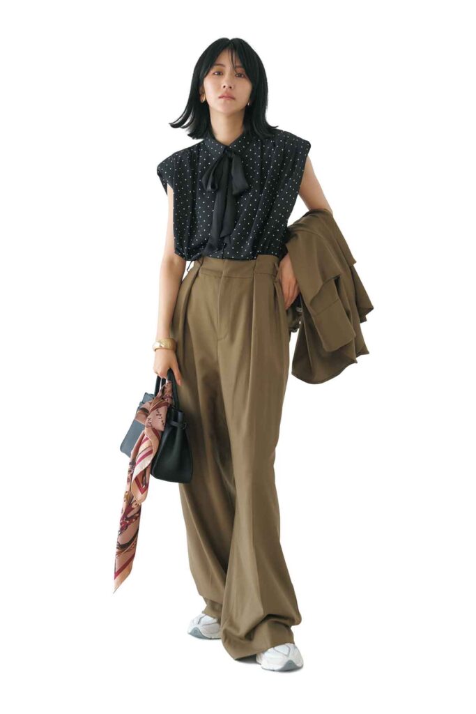 通勤服の定番・ワイドスラックスには、存在感溢れるボリューミィなスニーカーを。フルレングスでもバランスよく決まり、スタイルアップに役立ちます。ドットのボウタイブラウスの甘さをカジュアルダウンしてくれるのも嬉しいポイント。
