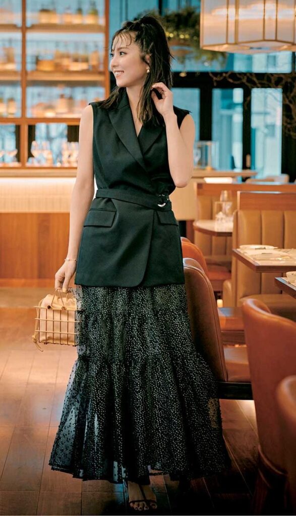 落ち着いた印象のブラックコーデこそ、ディティールに凝るのが大人流。チュールスカートやハートモチーフのベルトなどの甘口アイテムを際立たせ、レディなムードを楽しんで。仕上げに大ぶりなアクセサリーで華やかに盛り立てれば、会食やデートにもぴったりの大人コーデが完成します。