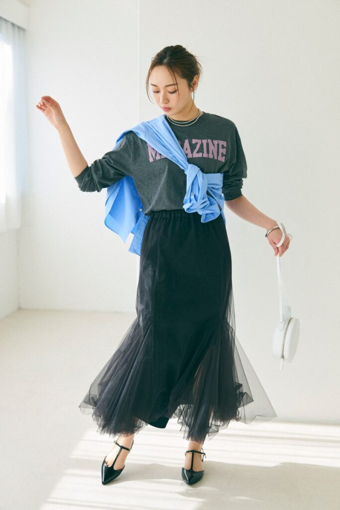 モノトーンコーデは、一歩間違うとそっけなく見えがち。ドレッシィなチュールスカートを選ぶことで、一気にこなれたムードが漂います。シルバーのアクセサリーやワンハンドルバッグで、ちょっぴりモードなスパイスを投入するとよりベター。