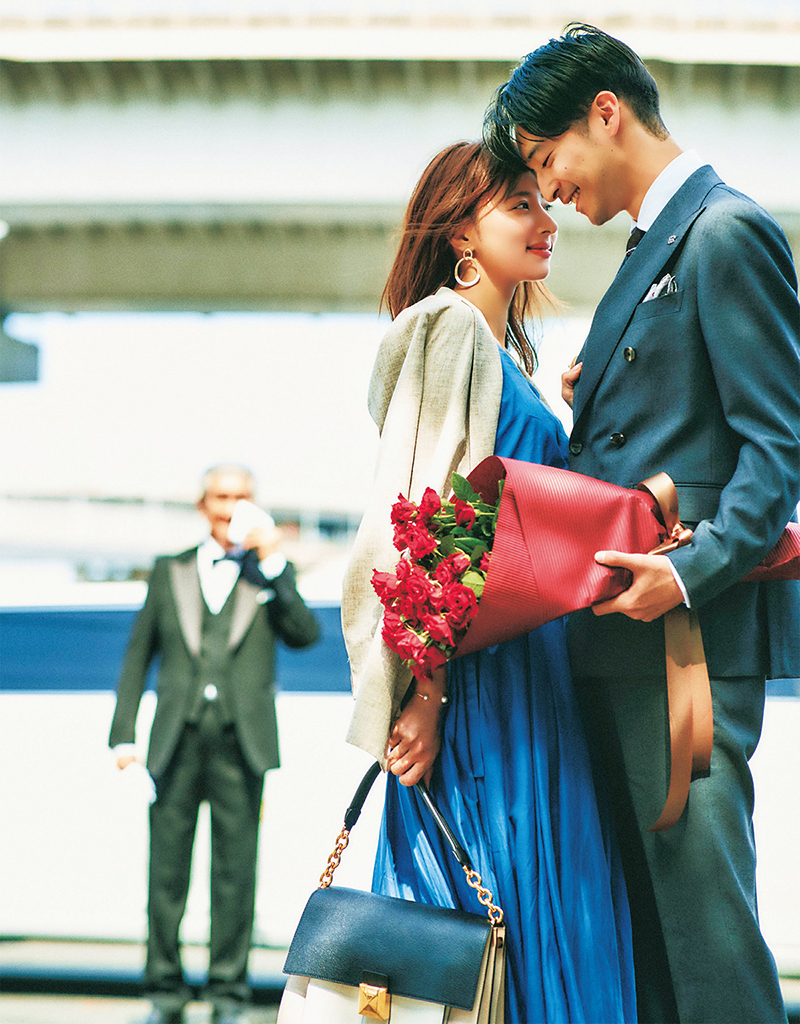 【男性】スーツ¥115,000〈タリアトーレ〉シャツ¥29,000〈サルヴァトーレピッコロ〉(ともにピッコログランデ)ネクタイ¥9,000チーフ¥5,500(ともにフェアファクス/フェアファクス コレクティブ)【爺や】24日と同じ