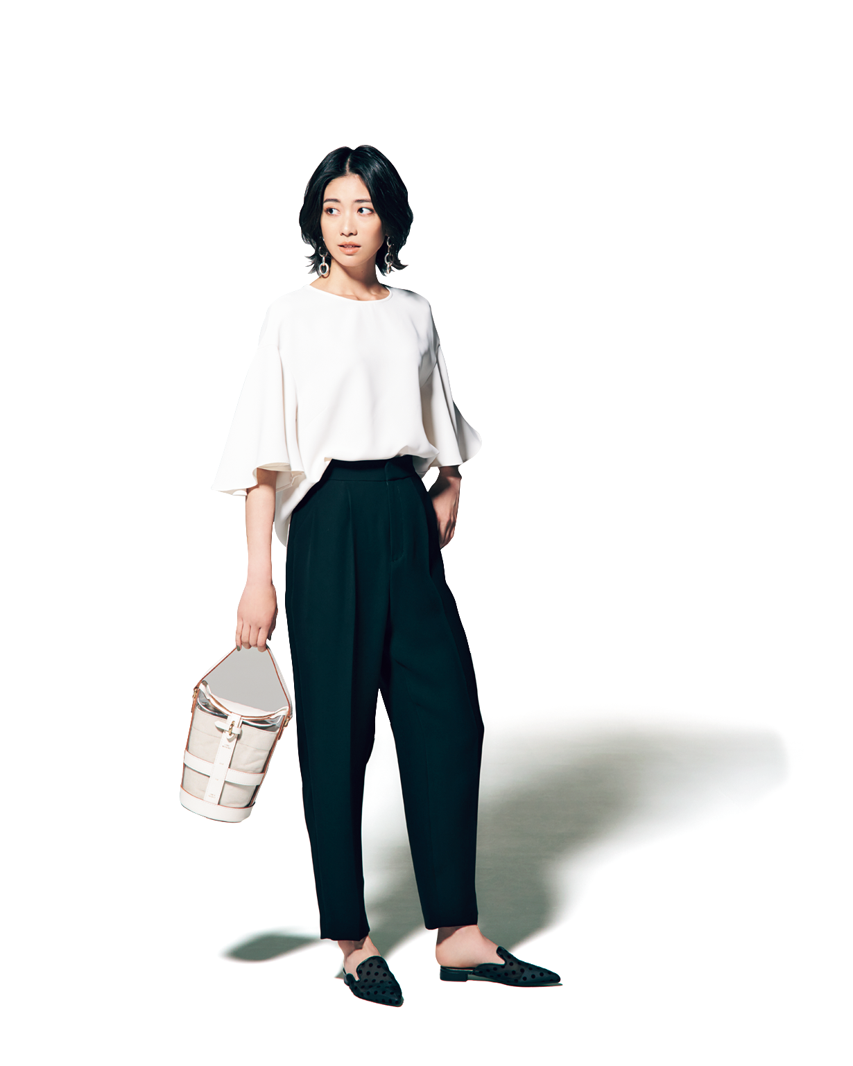 ブラウス¥7,900パンツ¥10,000(ともにステートオブマインド/ゲストリスト)バッグ¥29,000(オルセット/フラッパーズ)サンダル¥12,000(ダイアナ/ダイアナ 銀座本店)ピアス¥17,000(アビステ)