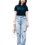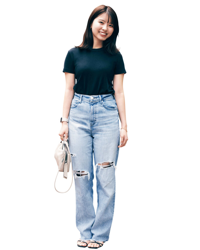 早起きが苦手なので前日のうちに決めておいたTシャツ×デニムで朝活。シンプルすぎないようにクラッシュジーンズをチョイス。華奢なゴールドアクセサリーできれいめコーデを意識。