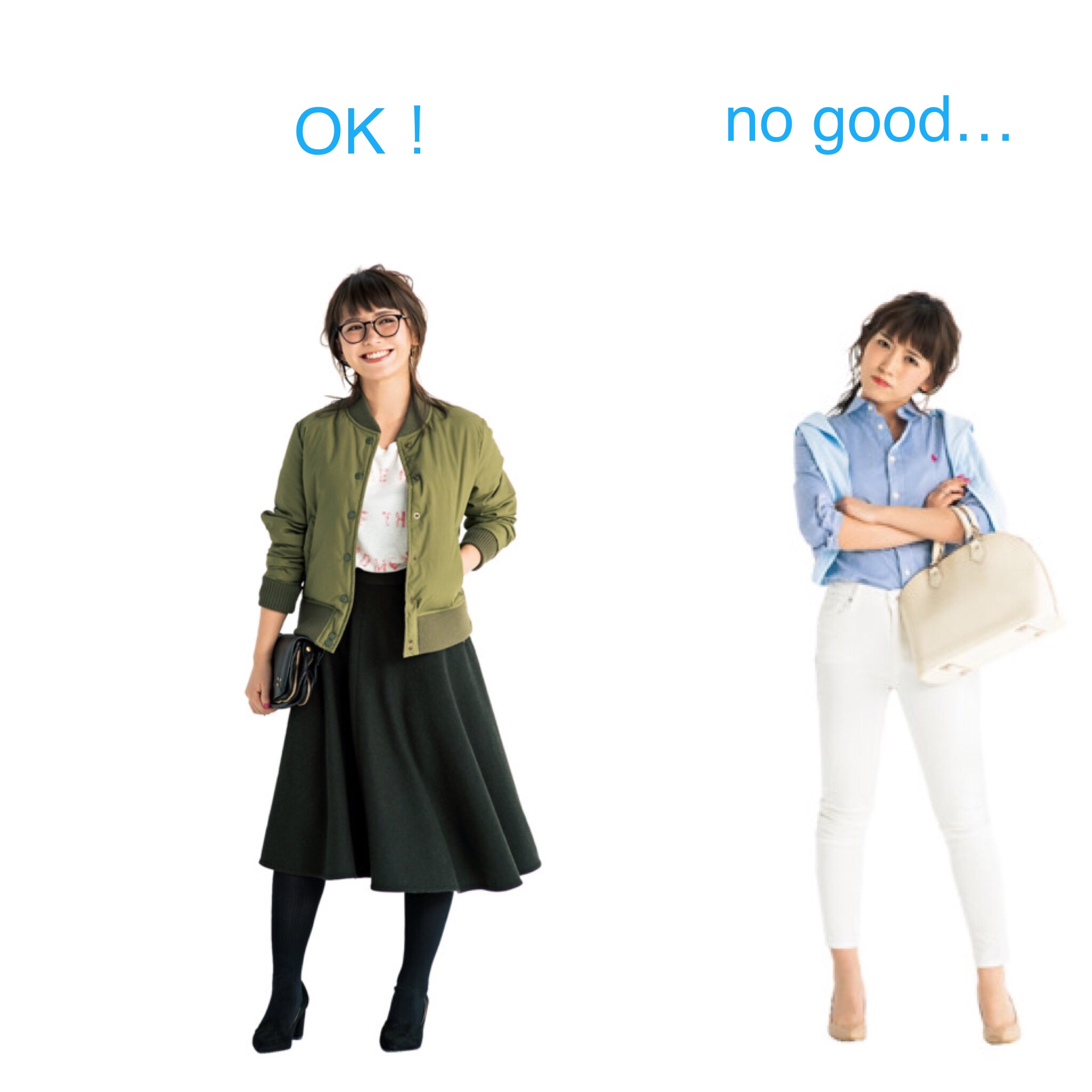 POINT…無難にまとめるのでなく、カーキやMA-1など辛口なものをセレクト。