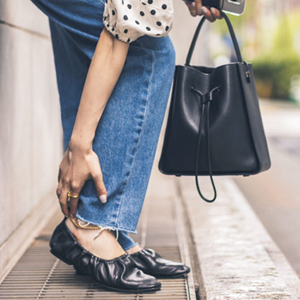 ローファーとかっちりバッグ、ウーフォスとおっきめバッグ…、バッグと靴の色や素材を同じトーンで合わせてスタイリング。そうすると、全体に統一感が出てオススメです。服がシンプルなときは、ドットのヒールやきれい色バッグでポイントを。