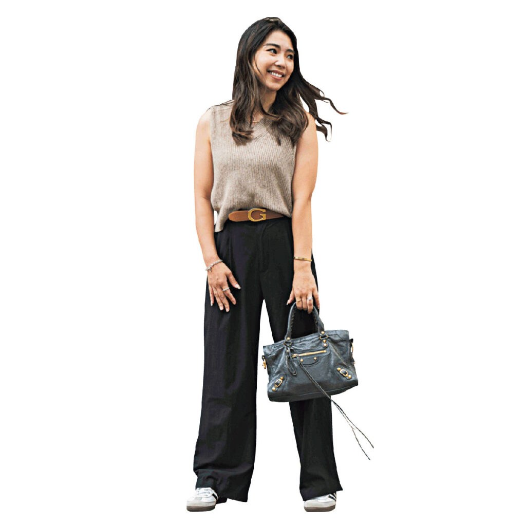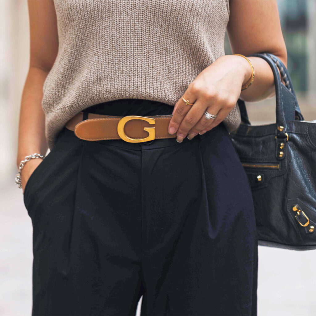 アクセントになるのにどんなコーデにもしっくり馴染む、グッチのベルトがお気に入り。ブラックコーデに合わせれば、華やかクールに決まります。