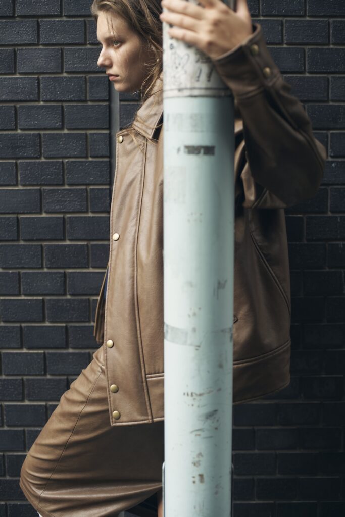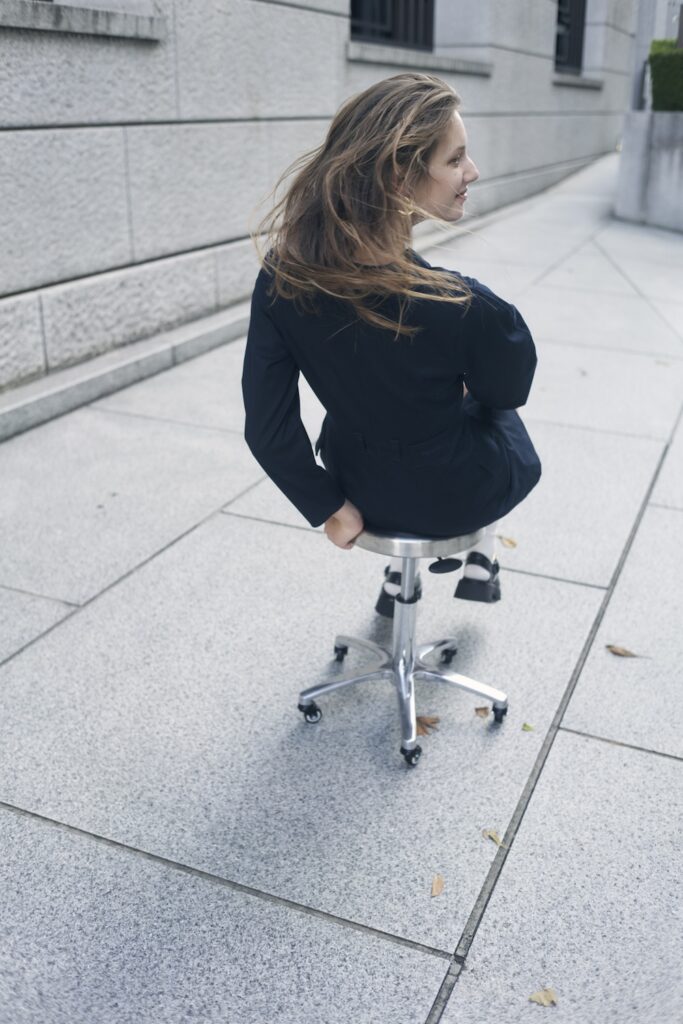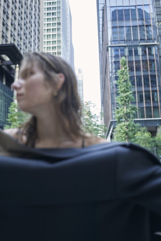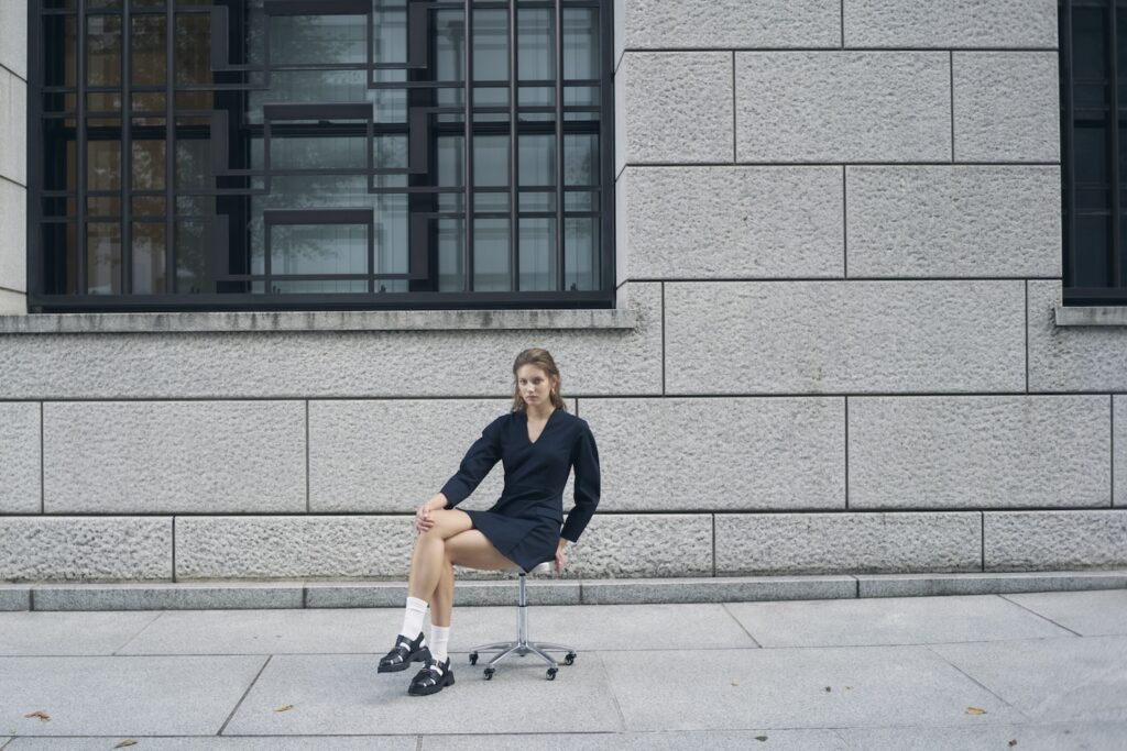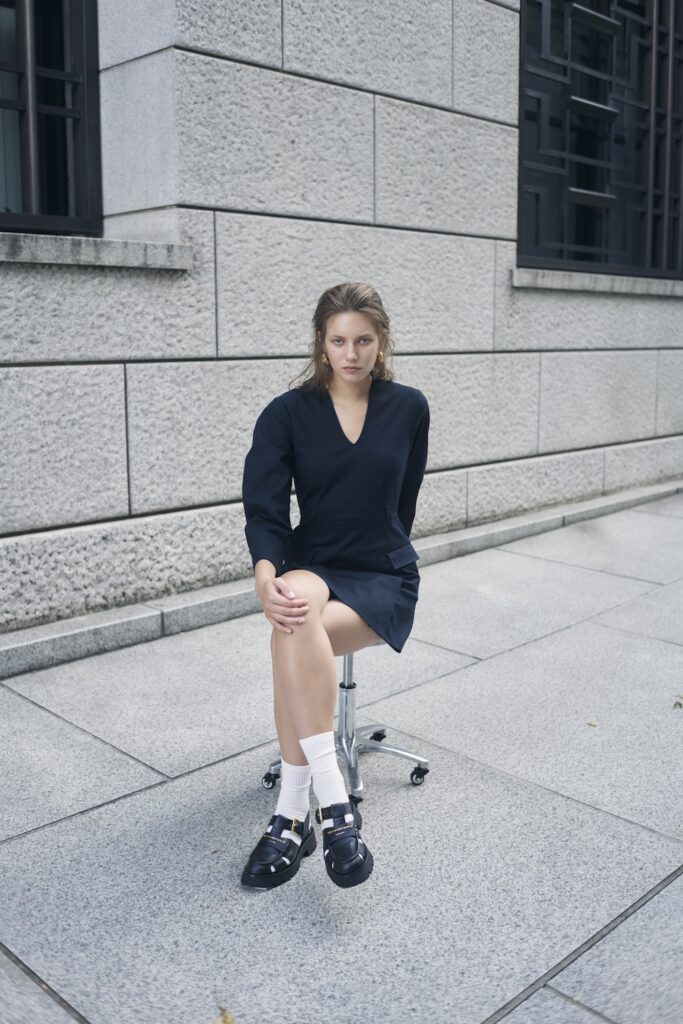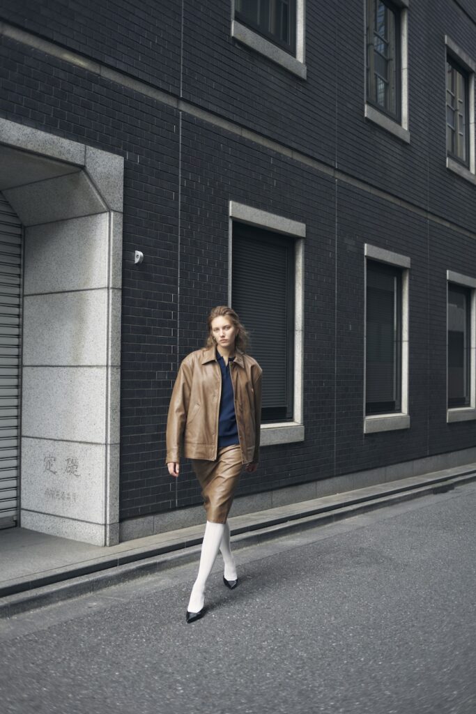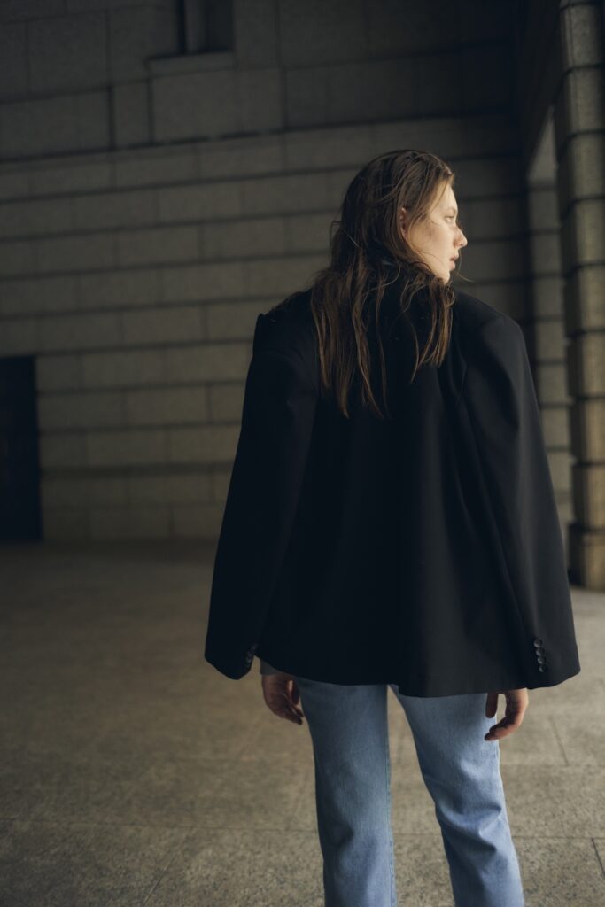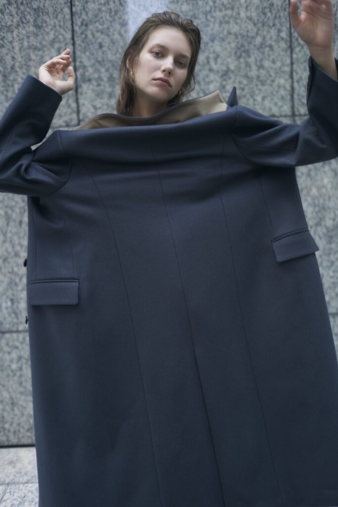 チェスターコートを着た時のメンズライクなボックスシルエットを、あえて肩パッドは入れずにカッティングとシルエットだけで再現。それによりほどよい落ち感を作りながらも、ボリュームを保っています。また、サイドの縫い目を無くしたバックスタイルのプリンセスラインにより、くびれが表現されているのが最大のポイント。東京ポップアップではいち早く試着、予約が可能です。