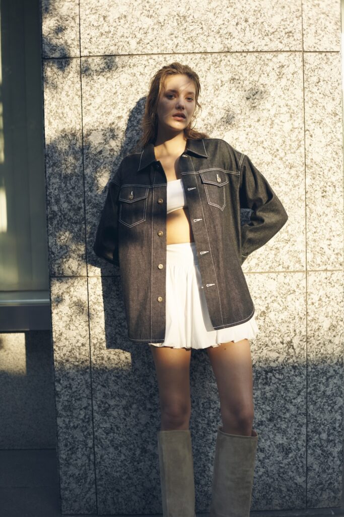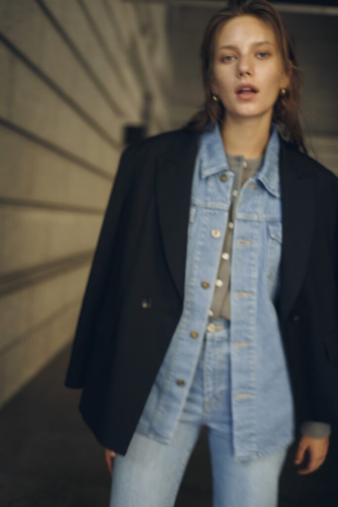 デニムコレクションには、デニムシャツとGジャンの要素をかけ合わせたデニムシャツジャケットが登場。裾のカーブはシャツのように軽やかでありながら、ポケットディテールやネオバボタンを使用してGジャンのヘビーさも取り入れています。アウターというより、ボタンを閉めてトップスとして着用できるアイテムに。カラーはICE BLUEとBLACKの2色で展開。ICE BLUEは前シーズン登場したデニムコレクションのICE BLUEカラーとセットアップで着用可能。