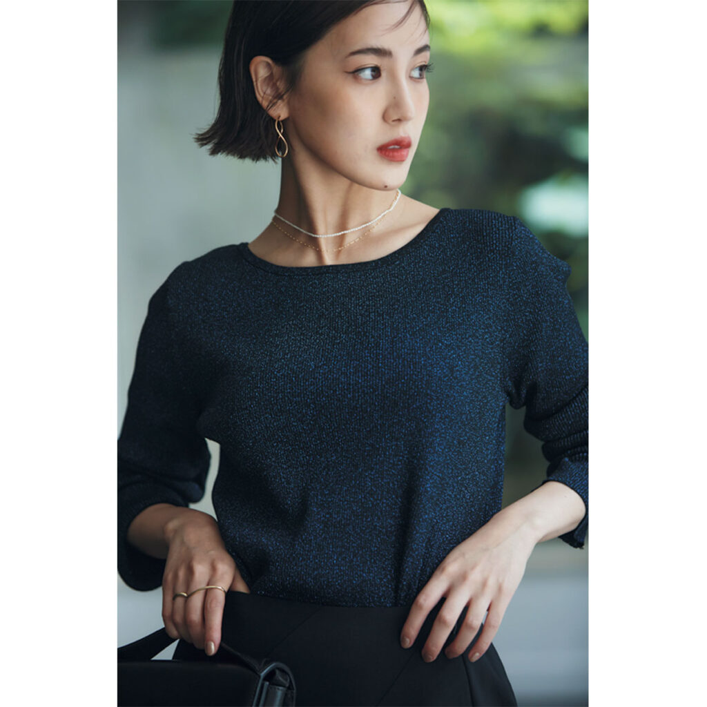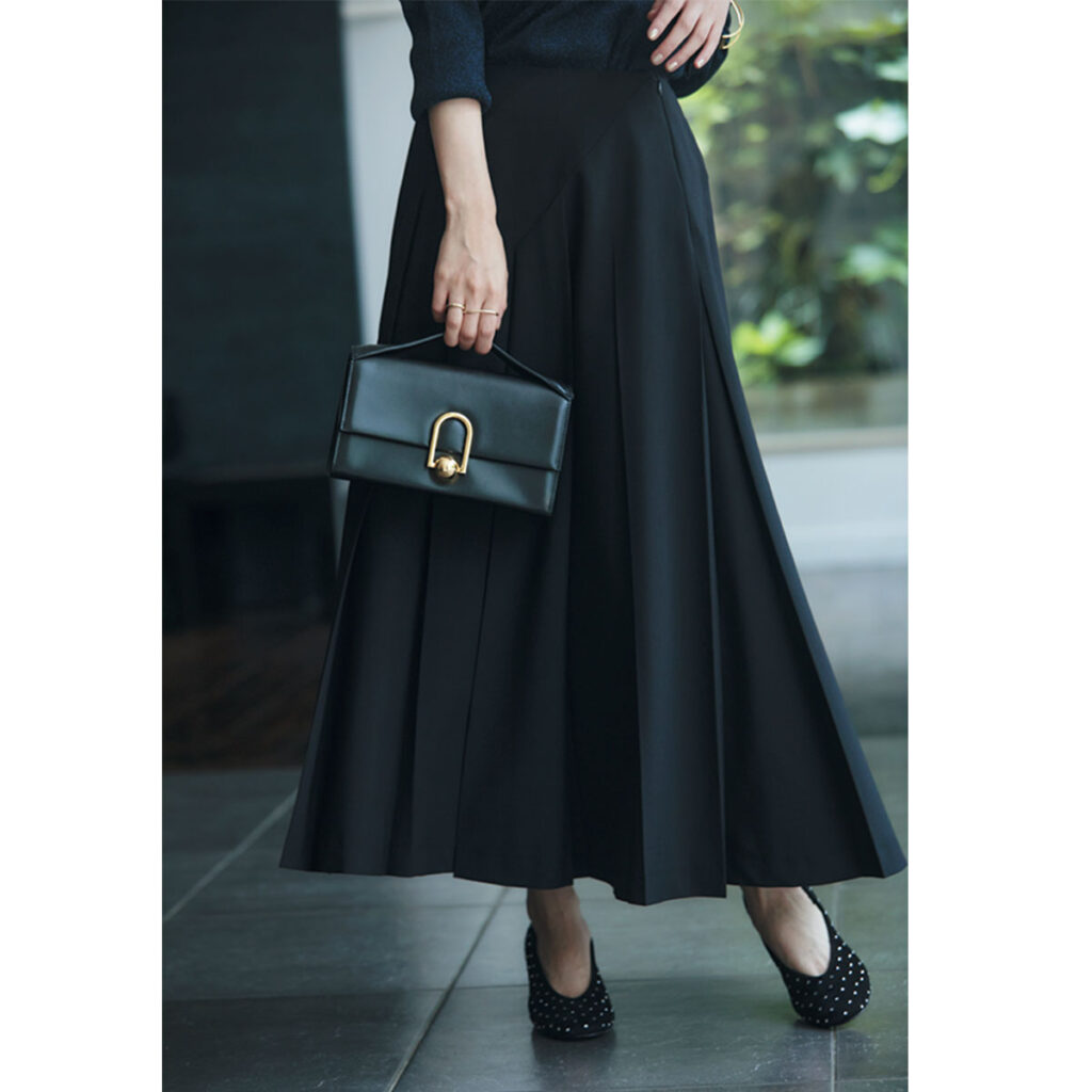 普段より後ろ姿を見られる場でもあるから、バックシャンな1枚で抜かりなく。トップス¥9,900(quaranciel/シップス インフォメーションセンター)スカート¥52,800(ソブ/フィルム)ピアス¥22,000(Jouete)パールネックレス¥40,700ネックレス¥113,300(ともにマリハ)リング¥40,700(リューク)バングル¥7,700(アビステ)バッグ¥82,500(マエストソ/アマン)パンプス¥192,500(セルジオ ロッシ/セルジオ ロッシ カスタマーサービス)