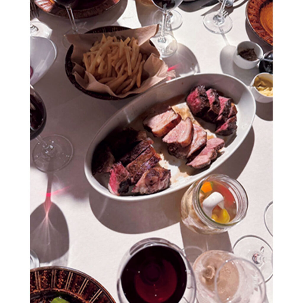 「ヴィラに宿泊するゴルフ合宿の打ち上げは、薪焼きお肉とピクルスが絶品の旧軽井沢『ピレネー』へ。テラスを貸し切り、ワインで乾杯!」