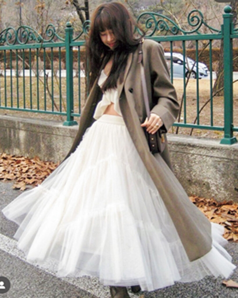 フェミニン派からの支持率が高いフレンチスタイルは、王道のパリ風味よりもロマンティックかつレディなムードが特徴的。トラッドをベースにトレンドのバレエコアや、甘めのアイテムを投入するのがコーデのルール。チュールやシースルーなど、透け感素材も多く、見るだけで華やかな印象に。さらにはスタイルの良さをアピールできるバランス感が韓国フレンチを確立するために欠かせない、超重要ポイント!肌見せやテイストMIXをうまく取り入れましょう。