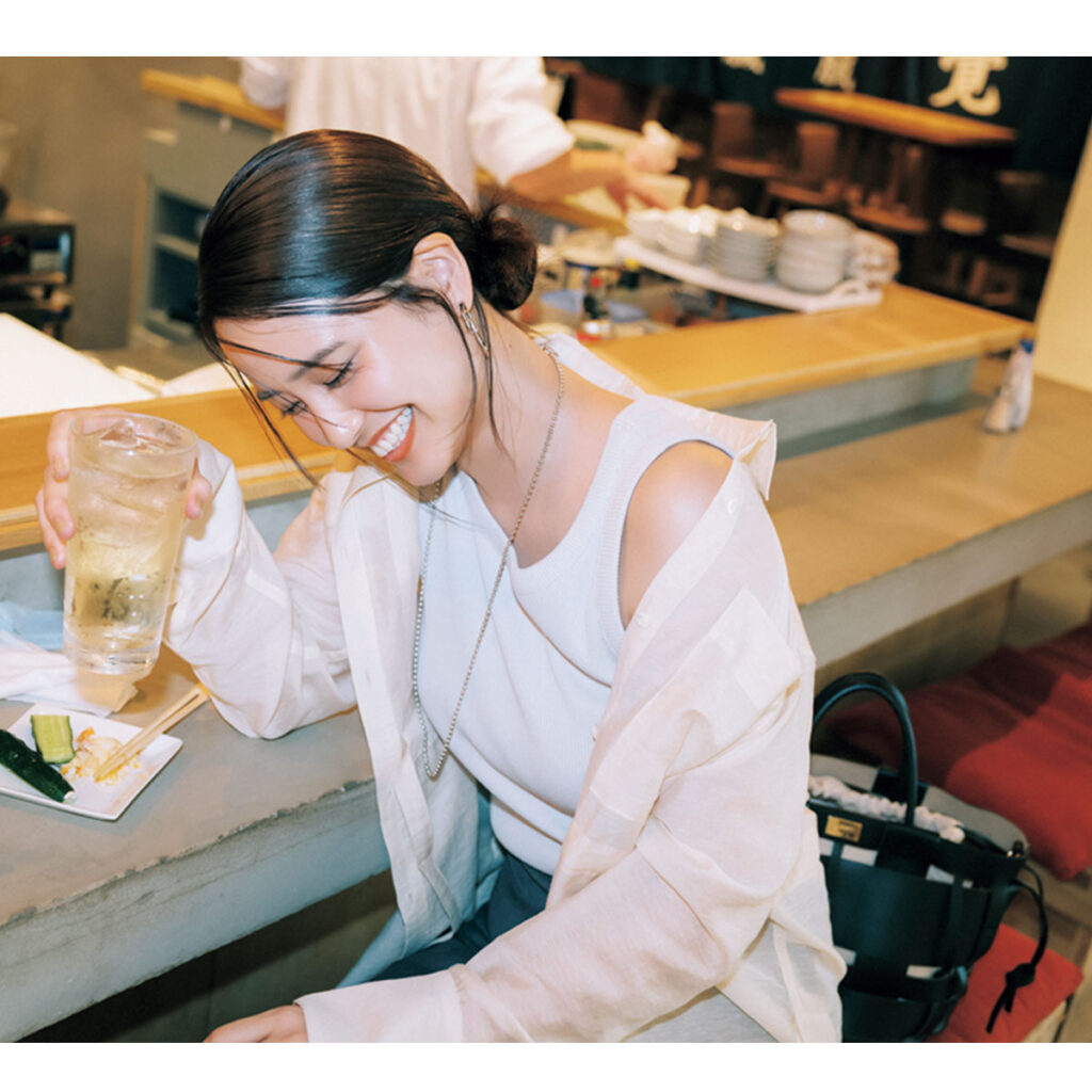 ゆるっとしたシルエットで、座った時の気になる部分もうまくカバーしてくれるシアーシャツ。食べて飲んで…の日も思い切りはしゃげます。足元はボリューム感のあるシルバーカラーのスニーカーで、はしご酒にぴったりの歩きやすさと洒落感を。シャツ¥34,100(RHC/RHC ロンハーマン)タンクトップ¥12,100(ebure/リトルリーグ)スカート¥25,300(ウィム ガセット/ウィム ガゼット ルミネ新宿店)バッグ¥170,500(ザンケッティ/八木通商)スニーカー¥19,800(ニューバランス/ニューバランス ジャパンお客様相談室)イヤリング¥3,300(アネモネ/サンポークリエイト)ネックレス¥57,200(マリハ)