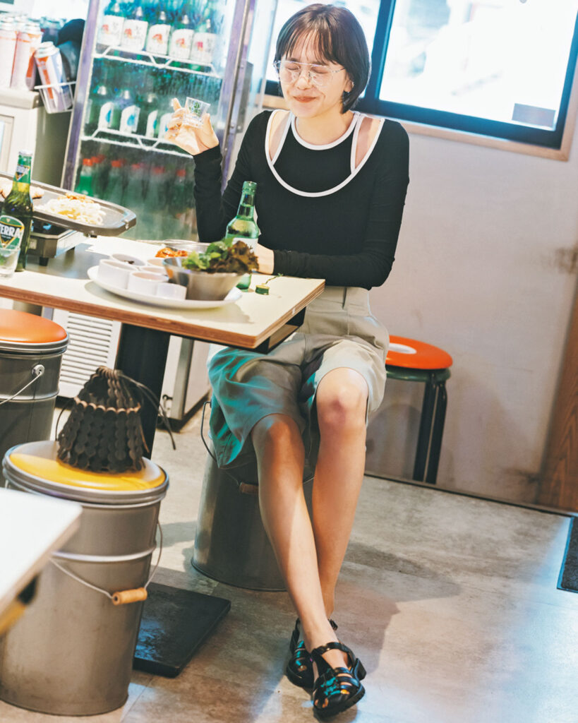 カットソー¥17,160 中に着たタンクトップ¥13,156(ともにEENK/NUBIAN SHIBUYAWOMENS)パンツ¥13,200(ノーク)バッグ¥28,600(メアリオル ターナ/デミルクス ビームス 新宿)サンダル¥21,780(ARTESANOS/セム インターナショナル)メガネ¥41,800(SPRING STRINGS/SHOWROOM CHRMR)イヤカフ¥13,200(アルティーダ ウード)リング¥21,120(バルブス/ZUTTOHOLIC)
