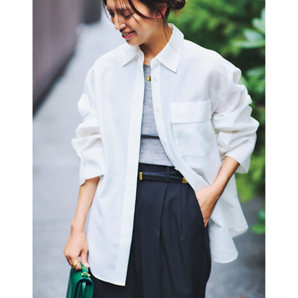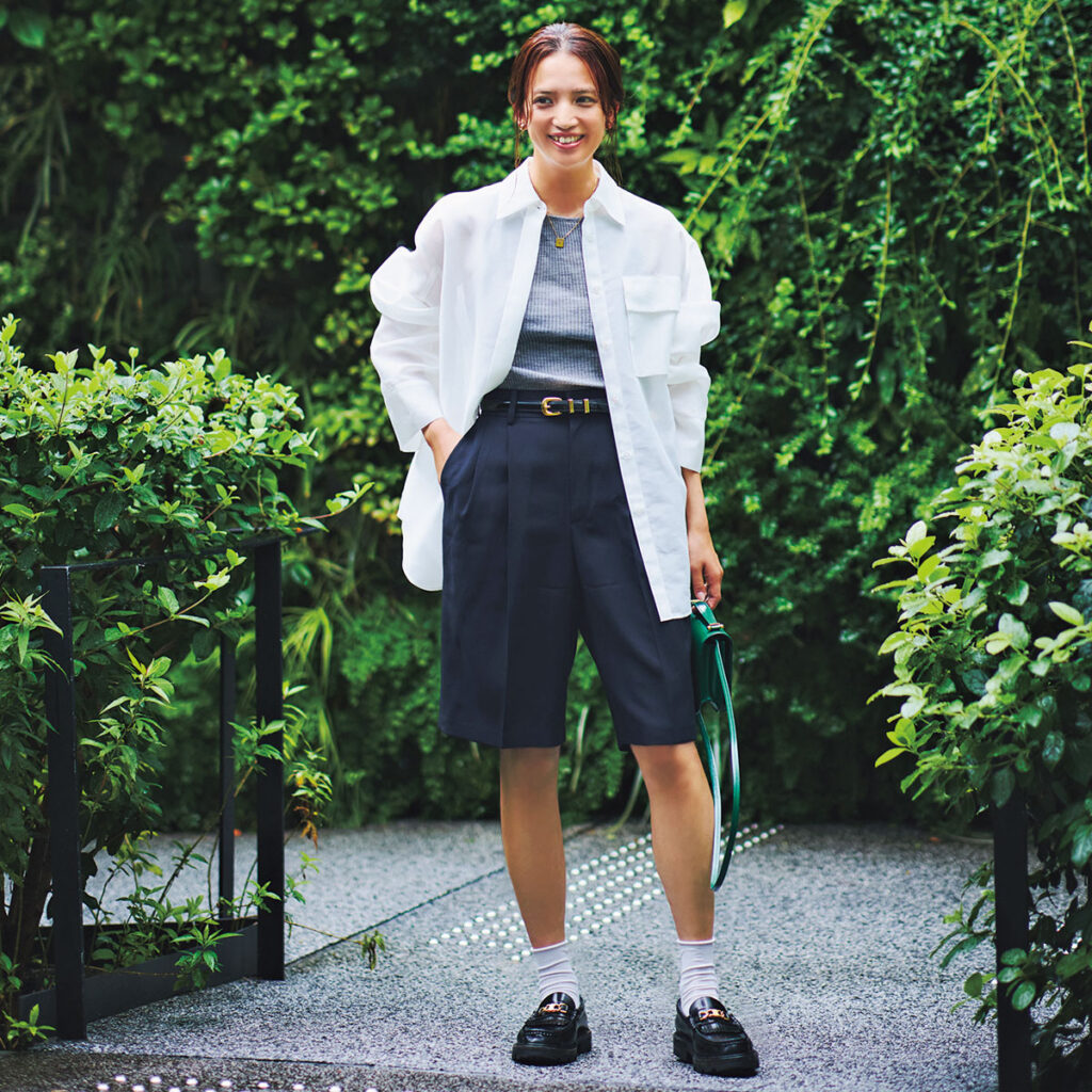 もともとシャツが好きなのですが、夏はアメスリ率が高まるので、露出の多さを抑えるためにもシャツが必須。透け感のある白シャツに膝丈のハーフパンツを合わせて、今年らしいマニッシュコーデに。緑のバッグは差し色代わり。