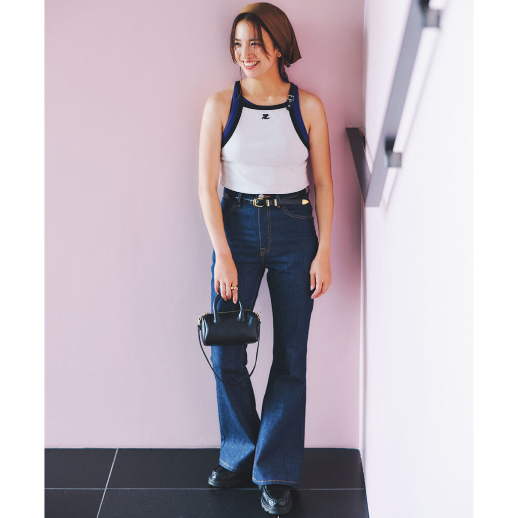 cut & sewn_courrèges、tank top_GOOD PEOPLE GOOD STITCHING GOOD PRODUCT for ESTNATION、pants_NAILS、scarf_La Maison de Lyllis、earrings_Charlotte Chesnais、ring_Charlotte Chesnais、bag_WITH GOOD SHOES、belt_CELINE、shoes_CELINE