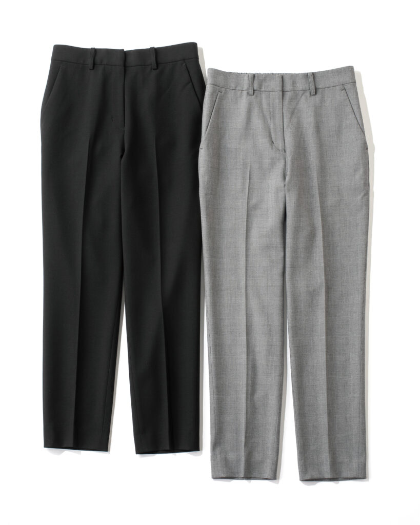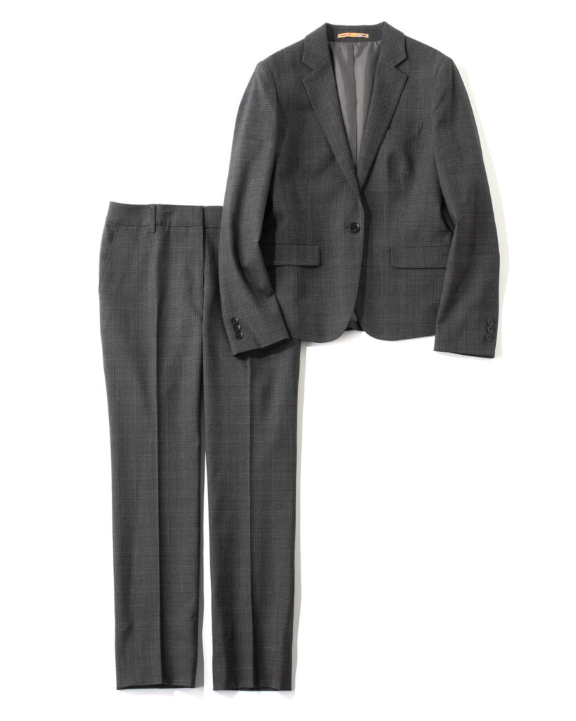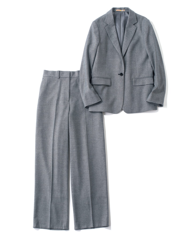 ジャケットはやや長め丈。シングルボタンだから開けても閉めても着こなしやすい。パンツはワイドすぎないシルエットのセンタープレス。どちらも動きやすいストレッチ素材で、もちろんマシンウォッシャブルです。静電気を軽減する放電テープ付きというのも、秋冬のお仕事シーンにさりげなくうれしいポイント。