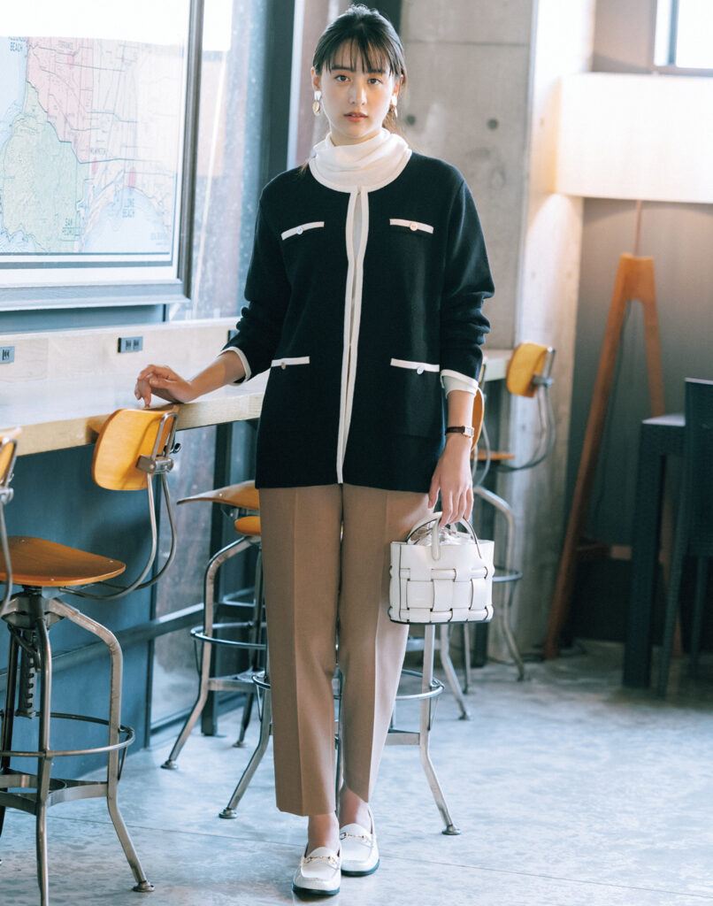 こんなふうに前を閉じても可愛いし、ジャケット代わりにも使えるデザイン。やや長めのミディ丈がゆったりしたムードをプラス。美脚見えで人気のORIHICAフラミンゴPANTS®にローファーを合わせて、大人っぽく着こなすのがコツ。ニットジャケット¥8,690 ニット¥4,290 パンツ¥8,690(すべてオリヒカ/オリヒカMARK ISみなとみらい店)バッグ¥53,900(オルセット/オルサ)シューズ¥29,700(ダイアナ/ダイアナ 銀座本店)イヤリング¥14,300(マージョリー・ベア/ココシュニック 新宿タカシマヤ店)時計¥18,700(マトウ/エイチエムエスウォッチストア 表参道)