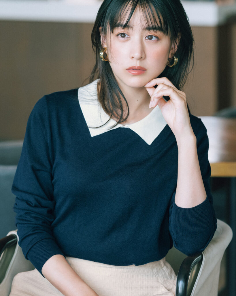 トレンドのポロニットはバイカラーでキレイめな印象に。しかもこのコスパ! トップスも優秀なオリヒカ、毎シーズントレンドに合わせた新作が出るのでぜひチェックを。ニット¥5,390 スカート¥8,690(ともにオリヒカ/オリヒカMARK ISみなとみらい店)イヤリング¥4,950(ジェイデンスター/ココシュニック 新宿タカシマヤ店)